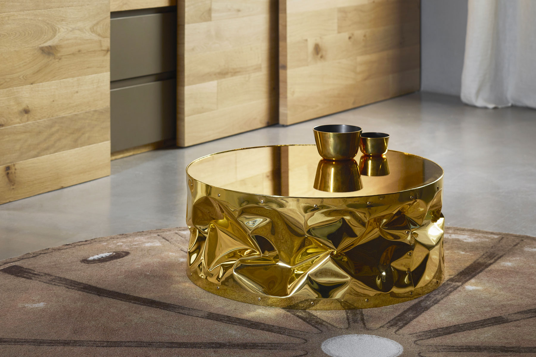 Tab.Ulino by Opinion Ciatti, is an aluminum coffee table designed by Bruno Rainaldi and is characterized by its wrinkled design, a real cool object somewhat reminiscent of a can.