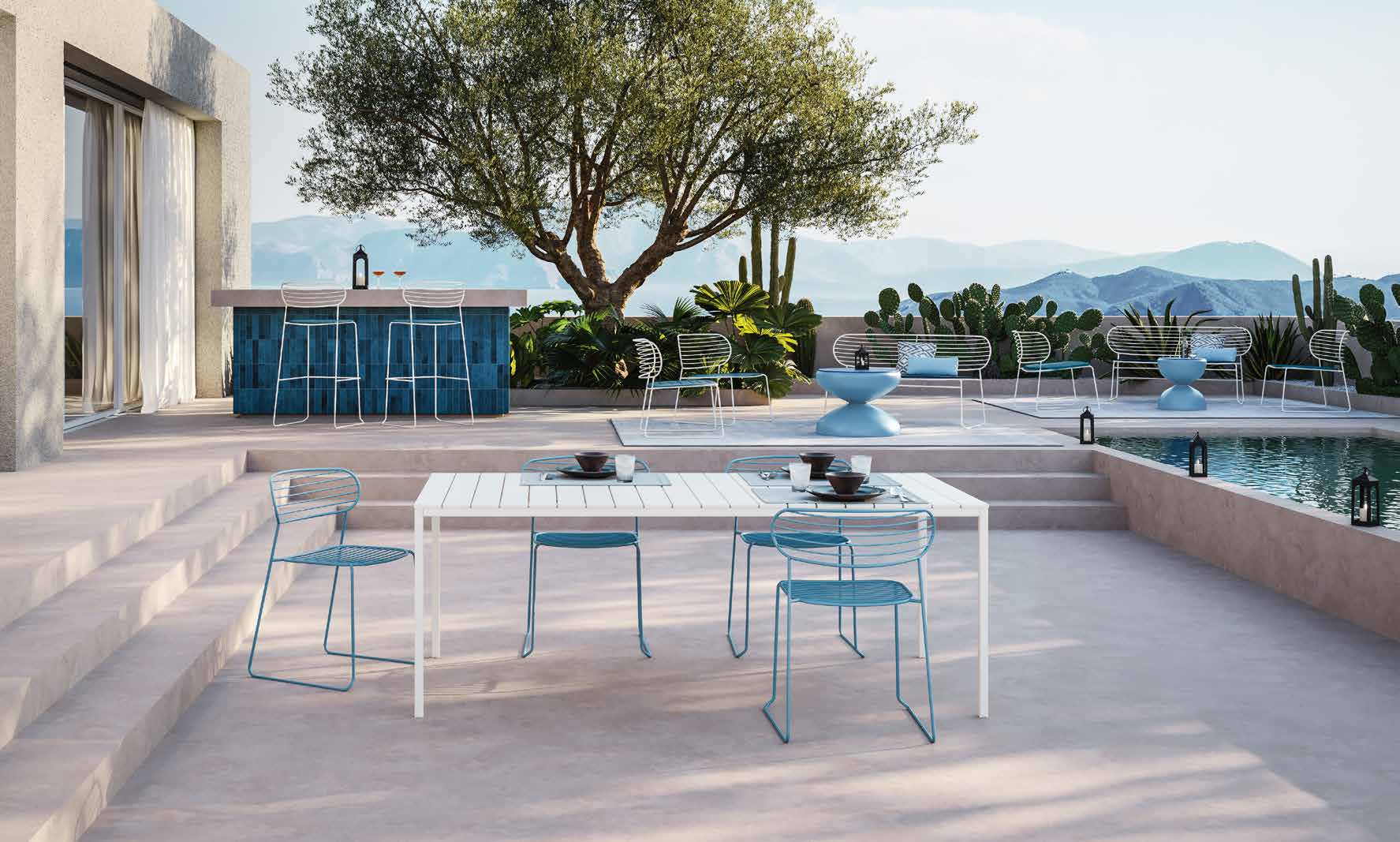 Chair, stool, bench, lounge chair, all elements are stackable, removable seat cushions are available among the accessories. Elba can be used