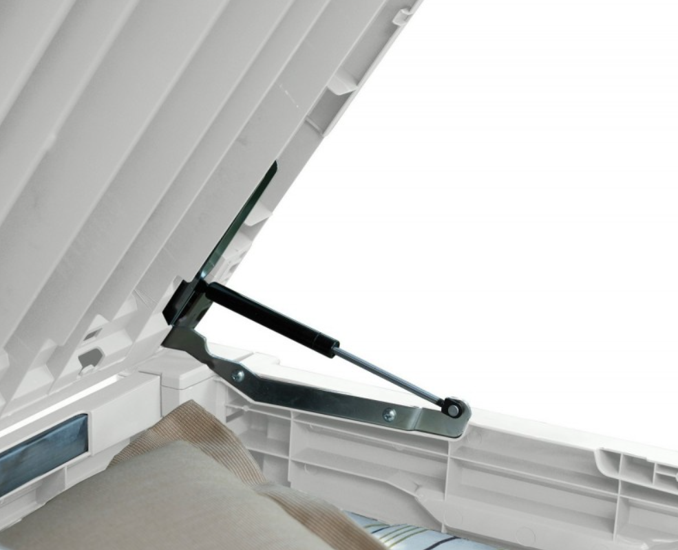 The lid with gas pistons makes it easy to open, while the reinforced structure allows it to also be used as a seat for two adults (up to 300 kg).
