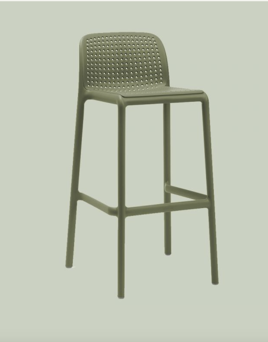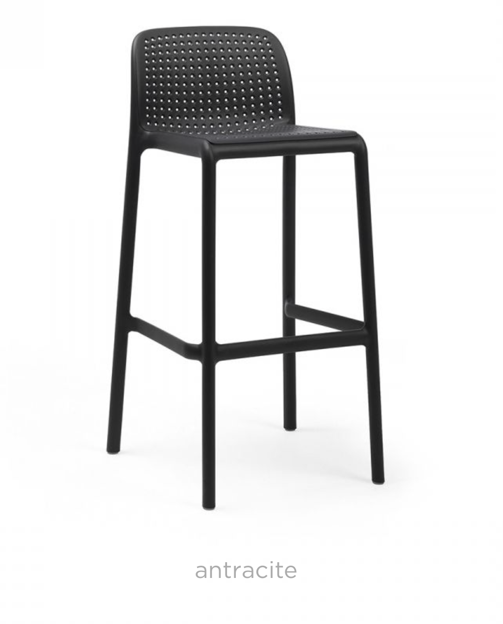 Monobloc stool. Polypropylene fiberglass treated anti-UV and colored in the mass. Matte finish. Equipped with non-slip feet. Seat height 76 cm. Recyclable resin.
