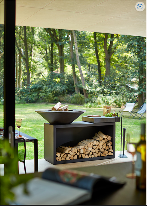 This multi-purpose unit combines unique style and functionality in a compact design. Made of resistant corten steel, available in 85 and 100 cm sizes with log holder, a solid wooden chopping board and a practical accessory tray for utensils and condiments.