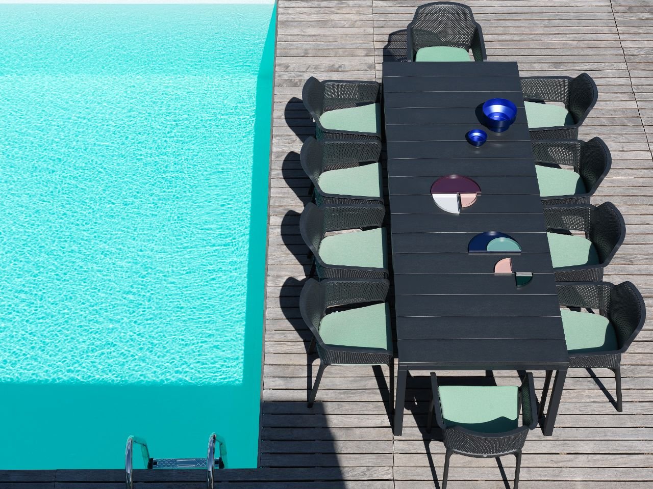 Refined relaxation for Net, monocoque in fiberglass resin carefully perforated with a motif of square and rounded holes distributed continuously on the three-dimensional surface of the seat.