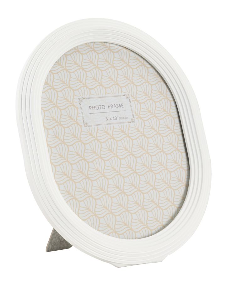 Oval free-standing frame in white resin with a simple and linear design. Photo dimensions 20x25 cm.