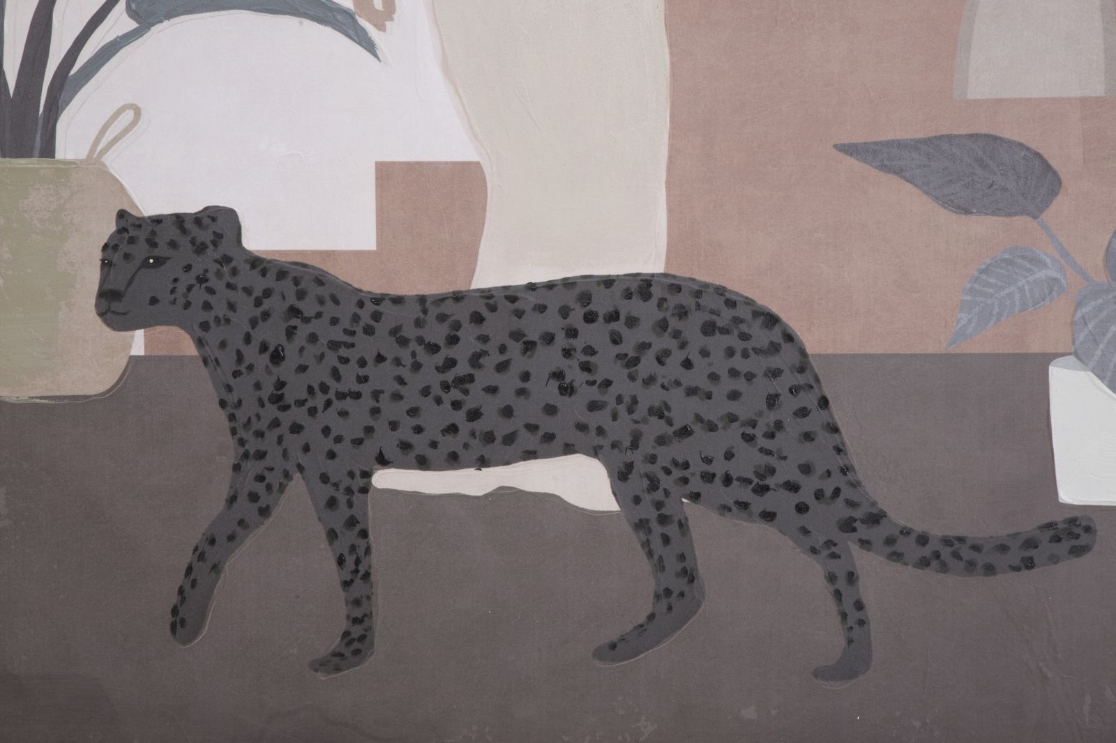 Painting on canvas with wooden frame depicting a woman with a leopard. The warm colors blend perfectly with any type of furniture.