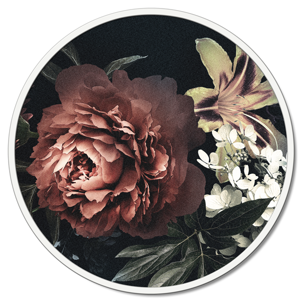 Round wood fiber panel covered in pure cotton canvas printed in high definition and with matt lacquered metal frame.