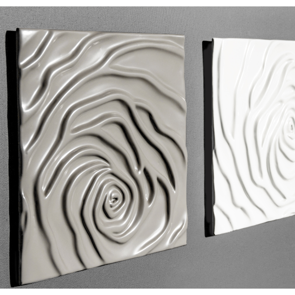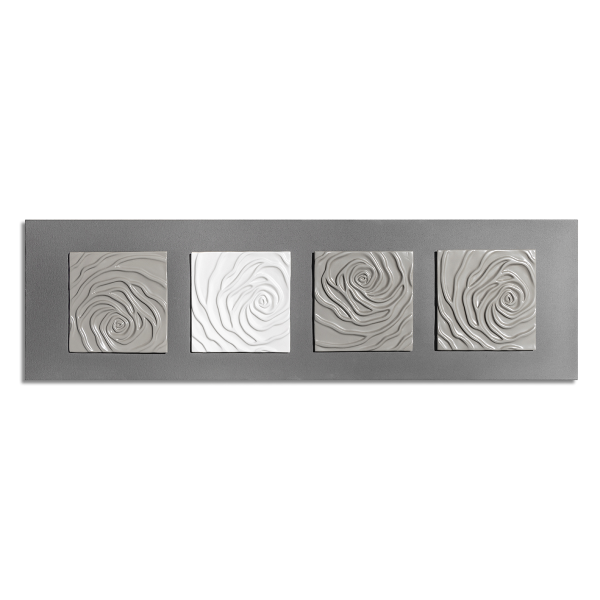 Gray lacquered canvas frame with four hand-decorated composite ceramic elements in ivory white and anthracite gray. 140X40 cm.
