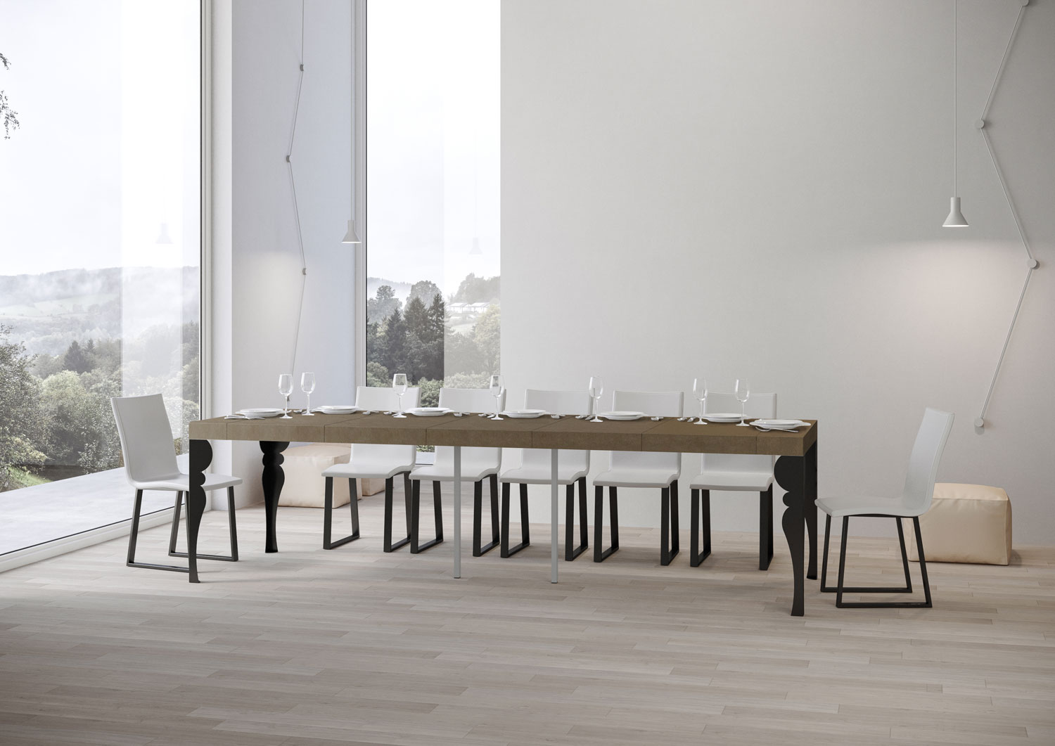Extending console table Paxon Premium, versatile and robust, a perfect furnishing solution ideal for any environment: entrance, kitchen, dining room, living room or hallway. The extending console table Paxon Premium can be turned effortlessly into a large dining table that can be extended up to 300 cm that can accommodate up to 14 people. Made of melamine boards and iron legs. The extending mechanism with telescopic aluminium rails and the provided central support system make the console table steady and sturdy. When the console table is collapsed, the extension leaves have to be stored elsewhere. Itamoby product Made in Italy Sizes: Closed console table: L.90 D.40 H.77 cm Length with 1 leaf: 92 cm Length with 2 leaves: 144 cm Length with 3 leaves:: 196 cm Length with 4 leaves: 248 cm Length with 5 leaves: 300 cm