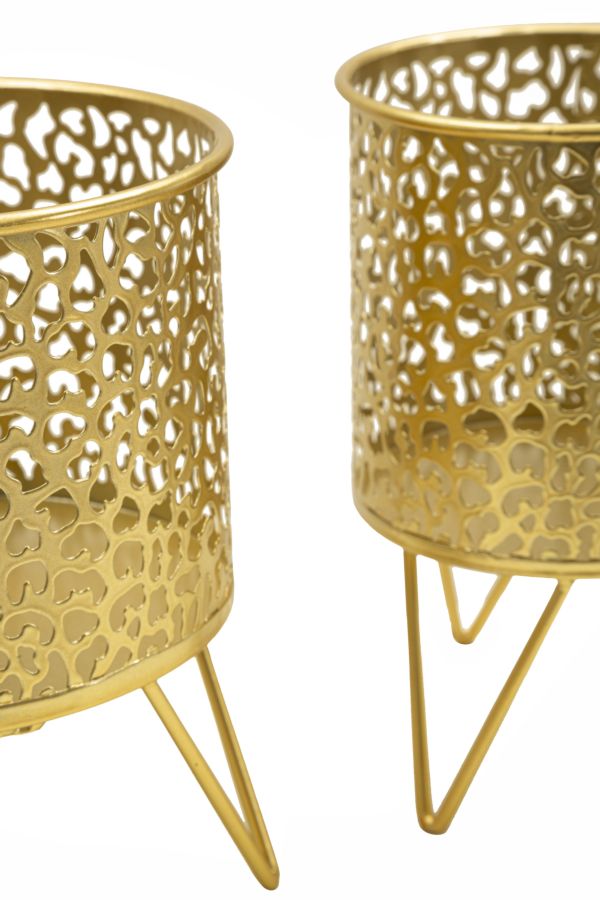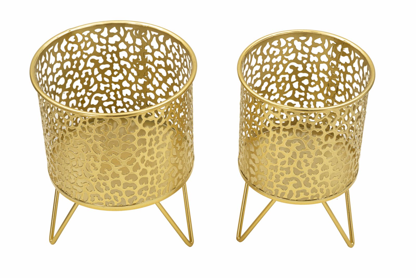 Pair of golden metal vase holders elegantly decorated with irregular and rounded carvings. Complete with golden metal support. The pots are removable from the supports.