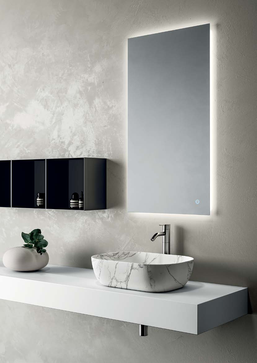 The integrated sink fits harmoniously into the structure, ensuring ease of cleaning and a minimal aesthetic. To complete the composition we find the coordinated mirror , with the possibility of LED light for a better visual effect.