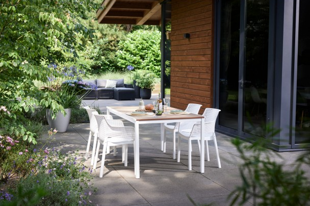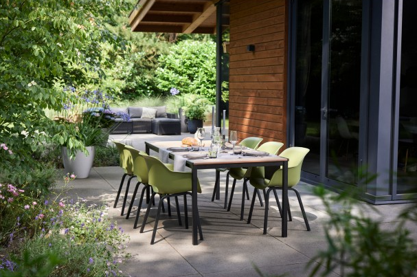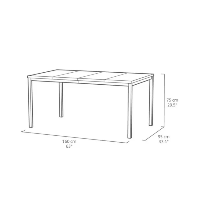 The Porto 160 garden table by Keter measures 159x95x75 cm and combines a painted metal frame (available in graphite or white) with a wood-effect top made of durable polypropylene.