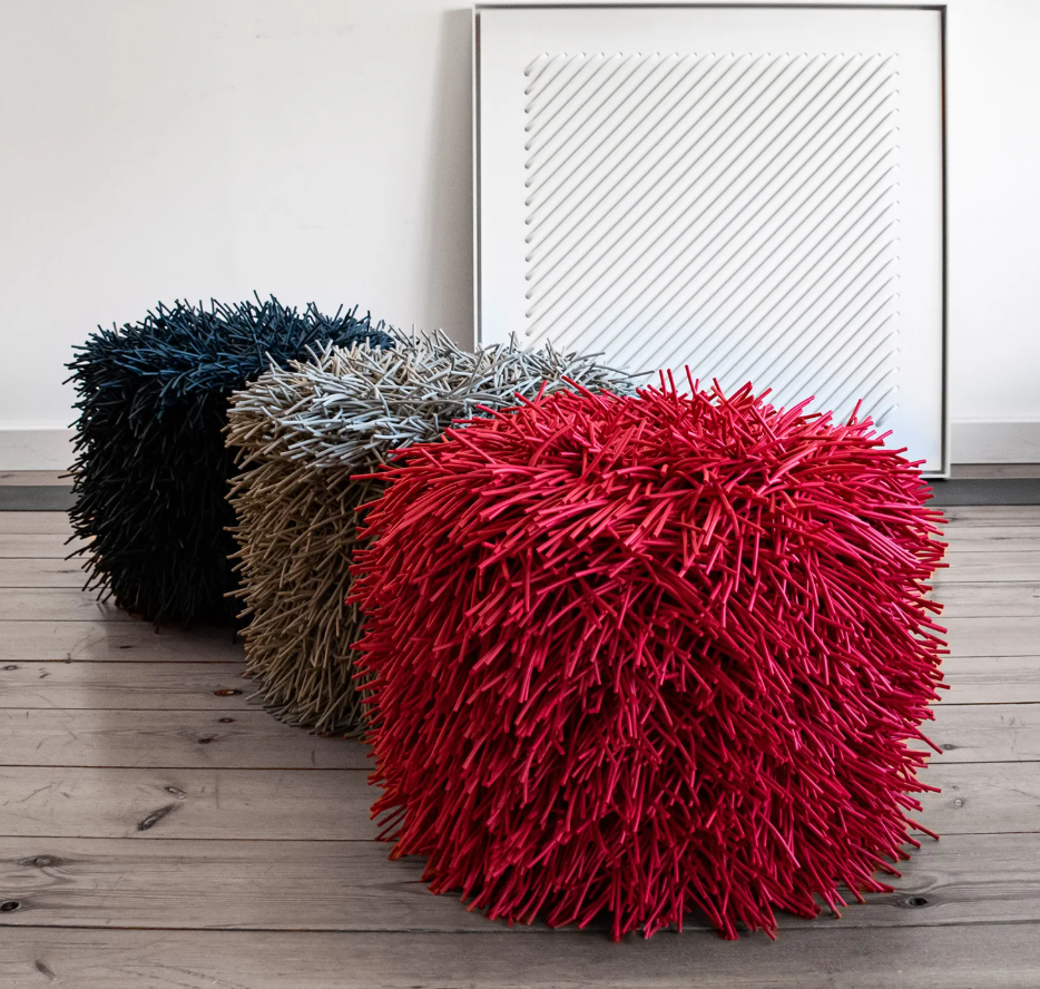 The Rebels poufs are made with neoprene thread of different thicknesses.