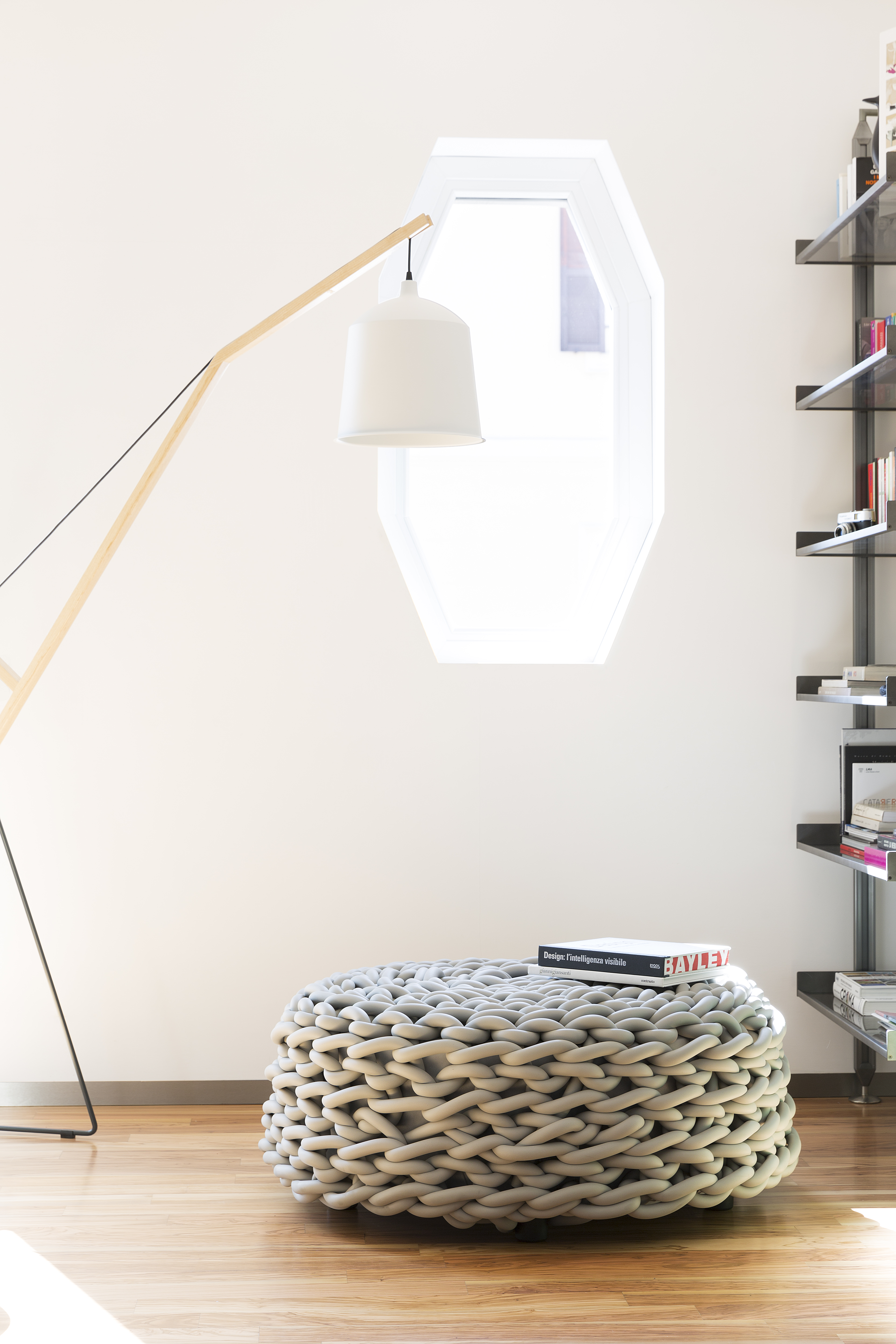 Rebels poufs are made with a neoprene thread of various thicknesses, flexible and soft to the touch, hand woven according to artisan techniques.
