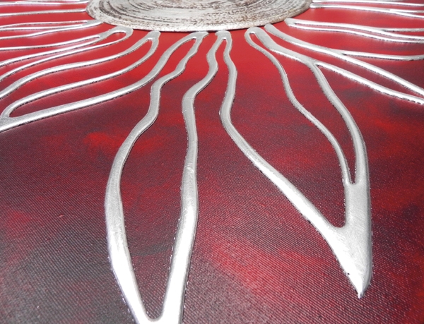 Relief elements hand-decorated with resins, material, silver leaf on linen structure, glossy finish.