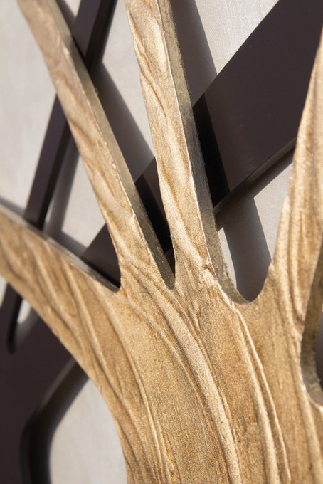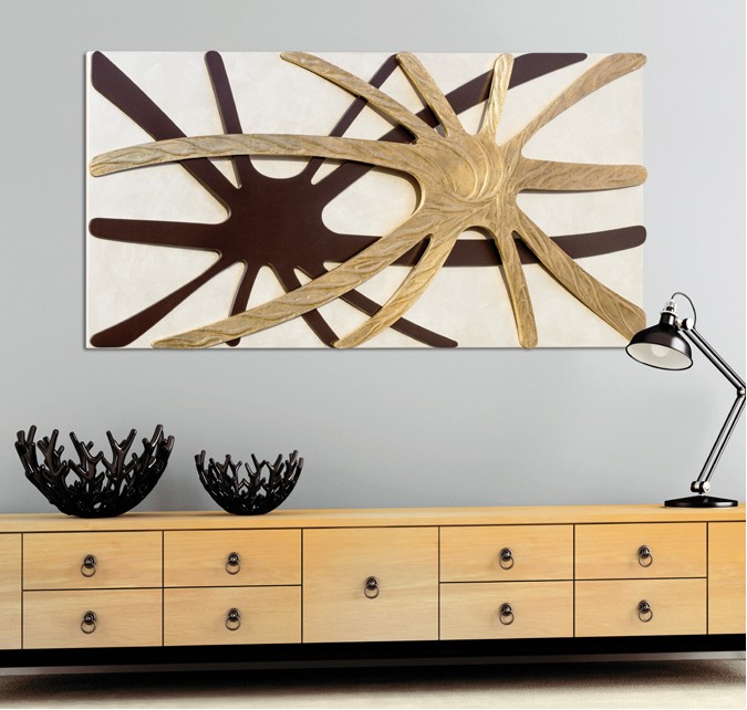 Mother-of-pearl canvas panel with two overlapping curved structures, coffee lacquered, hand-decorated on relief material and gold leaf.