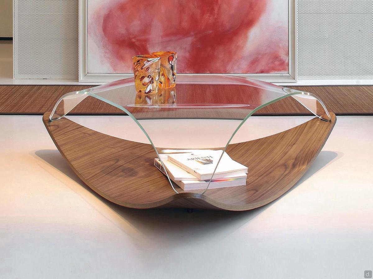 Coffee table in curved lacquered MDF or covered with wood with curved glass top.