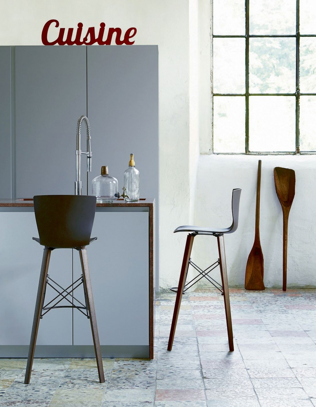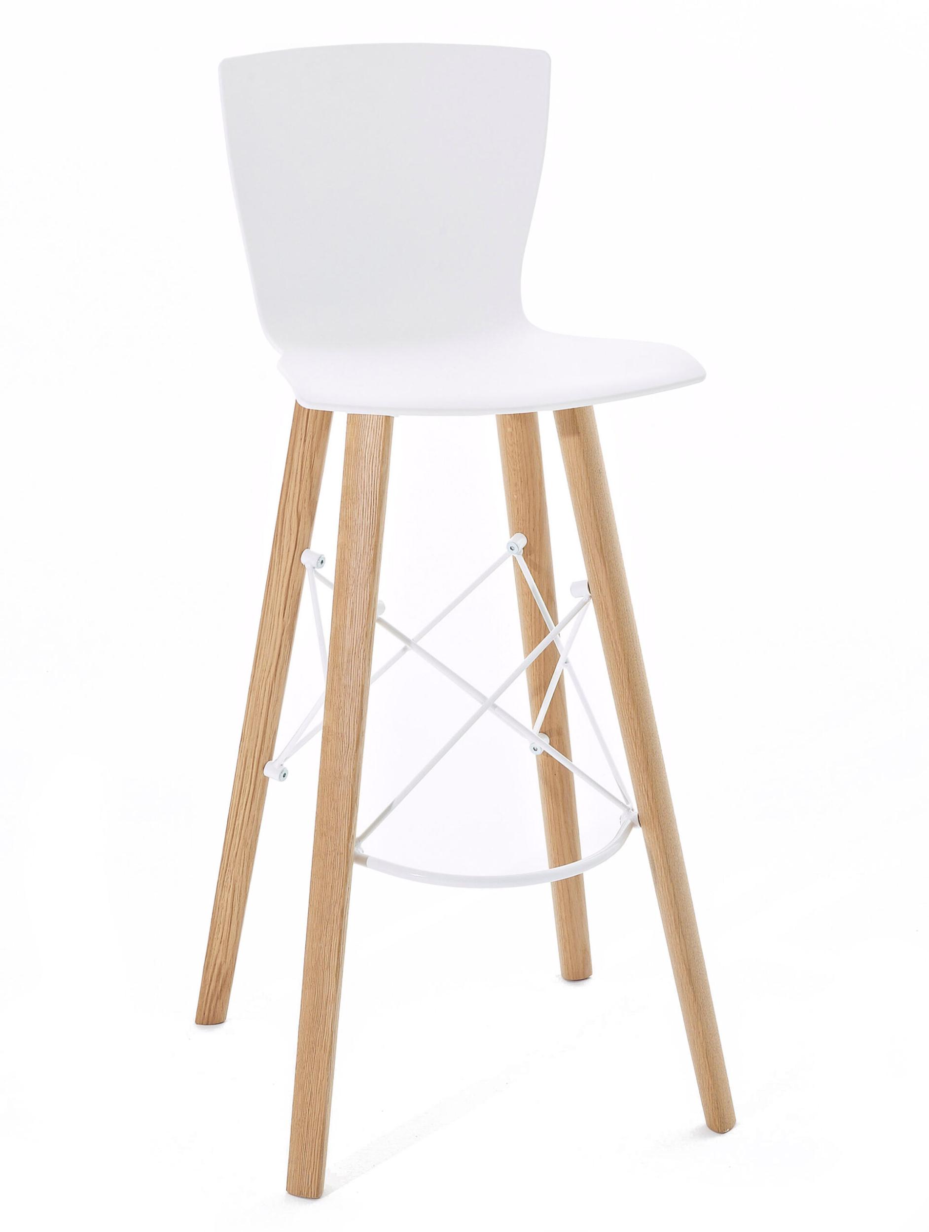 Stool with structure in oak wood and steel and seat in soft touch polypropylene.