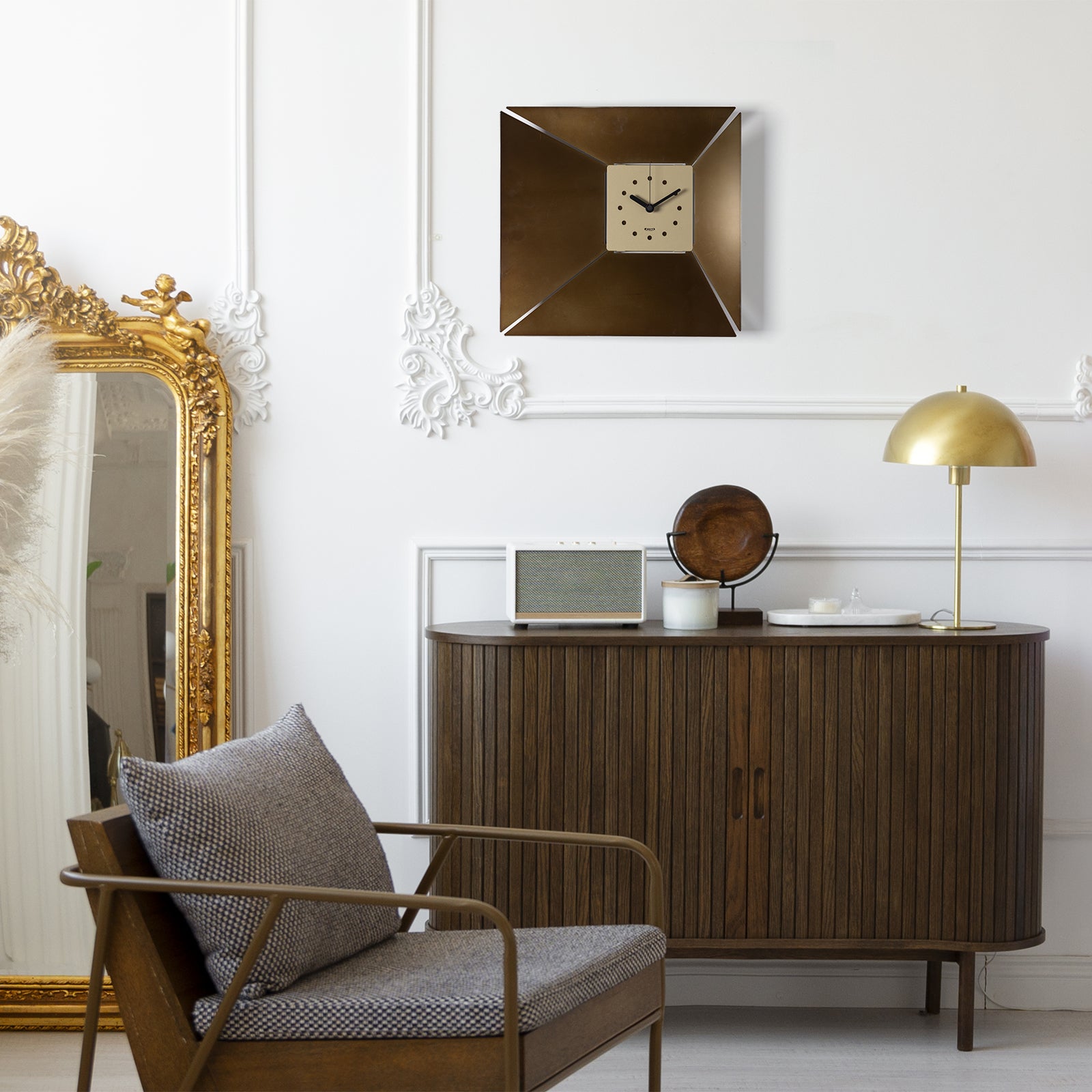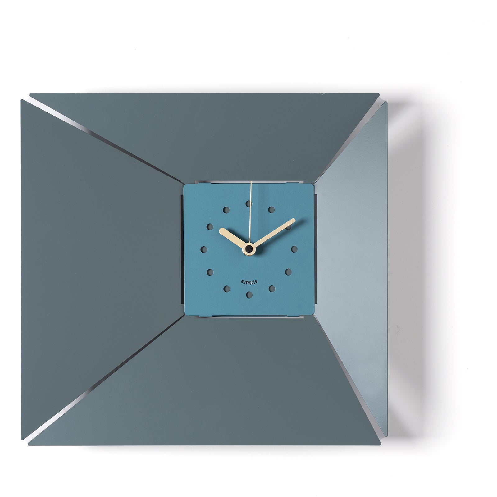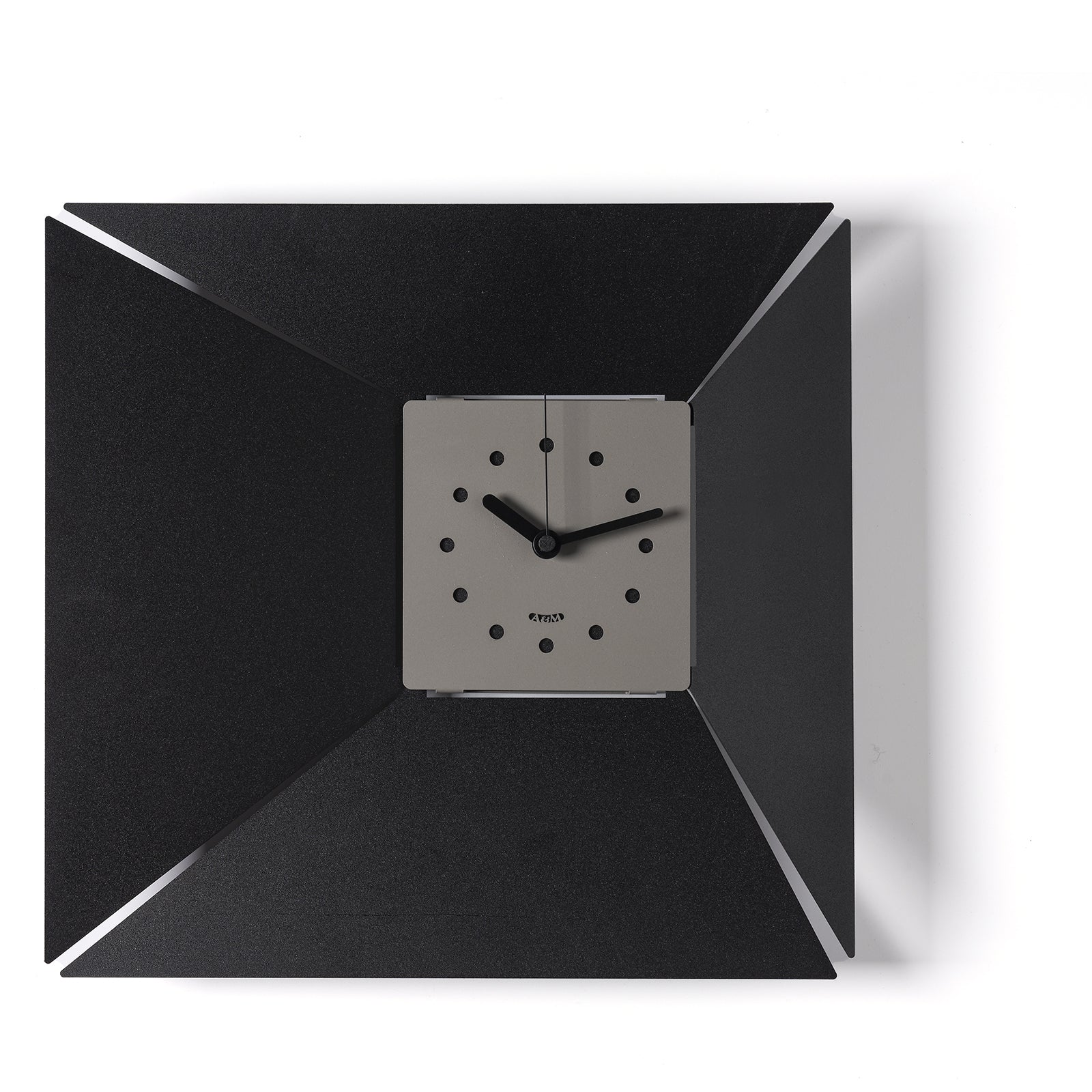 The structure is square, measuring 42 x 5 x 40 cm in height, but what makes it unique is the craftsmanship of the corners: perforated and slanted inward, they draw the eye to the smaller dial, which is also square and off-center. This detail creates a delicate, almost funnel-like perspective effect, emphasized by the 5 cm depth of the entire structure. The dial, despite its simplicity, is functional thanks to the presence of perforated circles that replace the numbers and allow for a clear reading of the time.