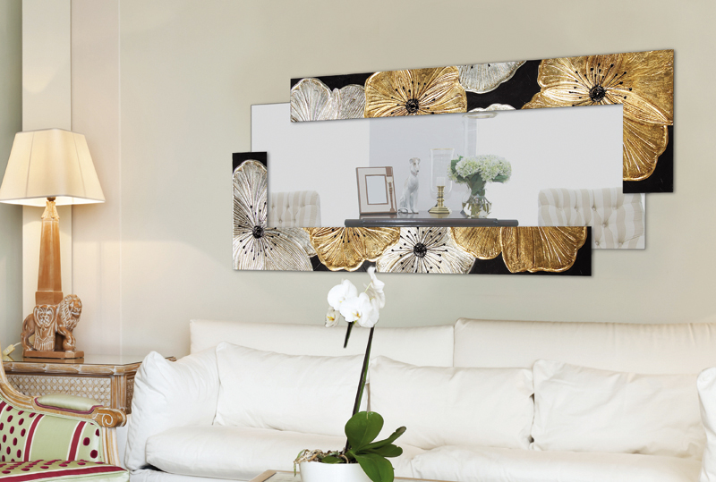 MIRROR cm190x80 (mirror 44x170 cm) GOLD variant Floral arrangement hand decorated resin details on textured, decomposed structure with cantilever mirror, horizontal / vertical posting, extra glossy finish.