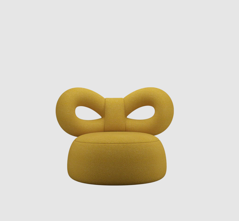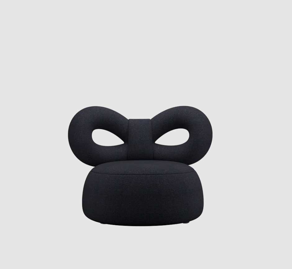The Ribbon armchair by Nika Zupanc for Qeeboo combines comfort and femininity, with the iconic ribbon backrest and a soft Orsetto fabric upholstery.
