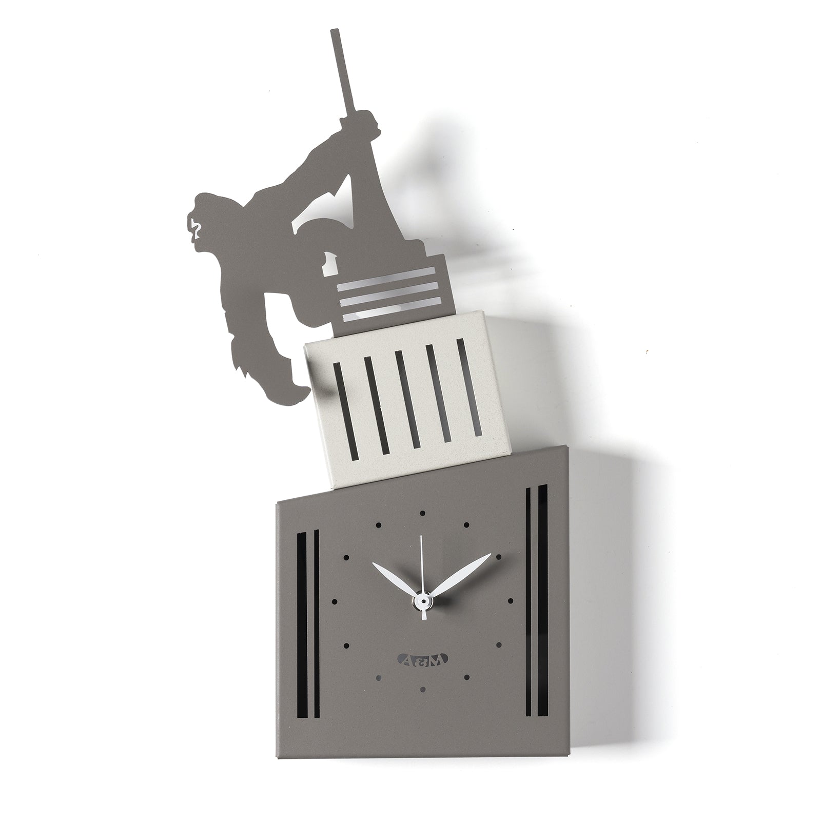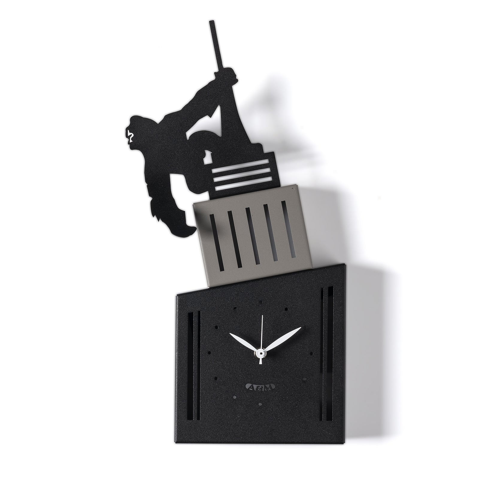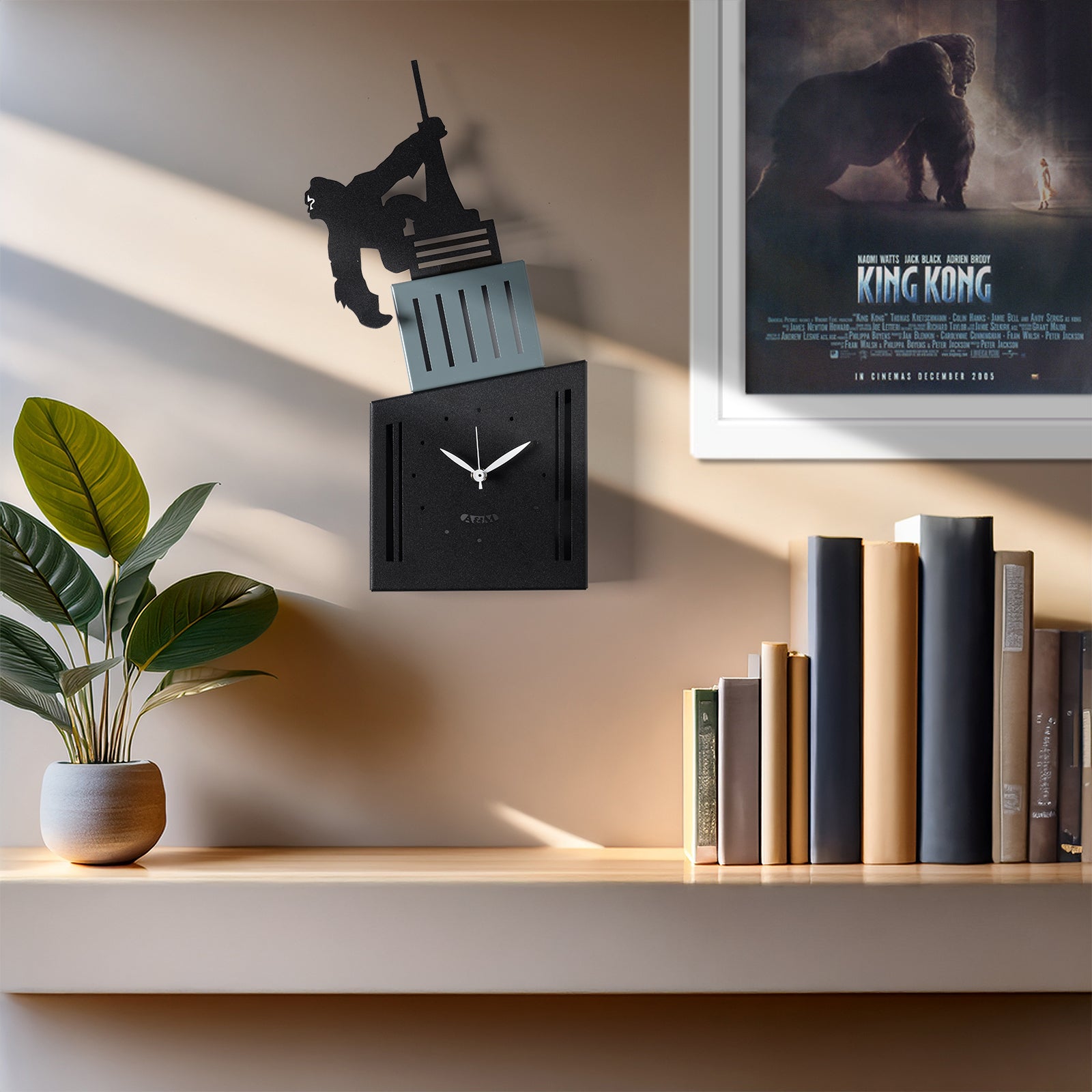 The famous gorilla is depicted climbing to the top of the building, a gesture that captures all the tension and power of the original film scene. A bold and impactful graphic design choice that transforms the clock into a true wall sculpture.