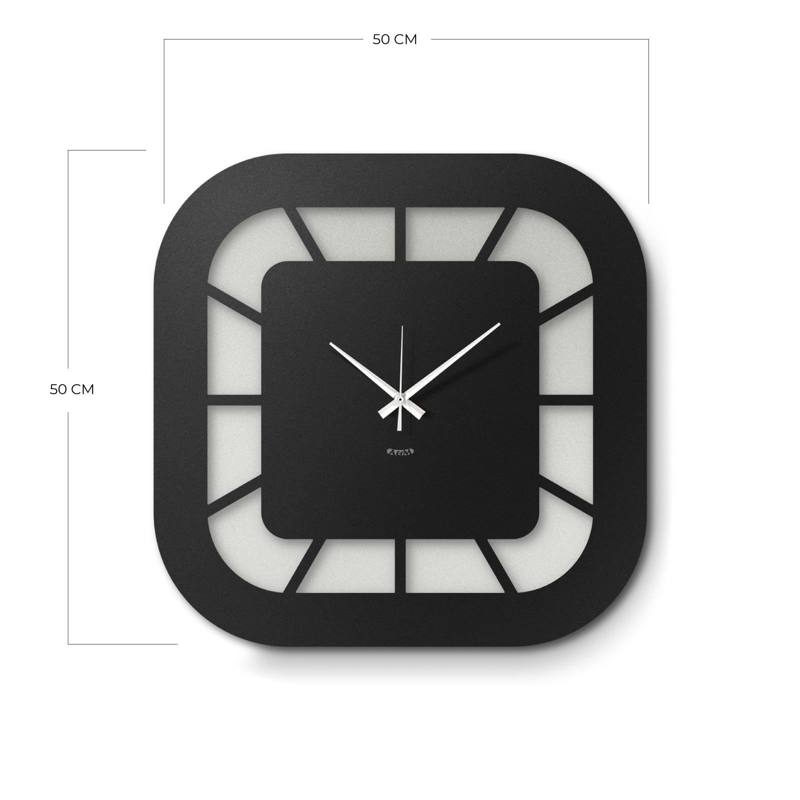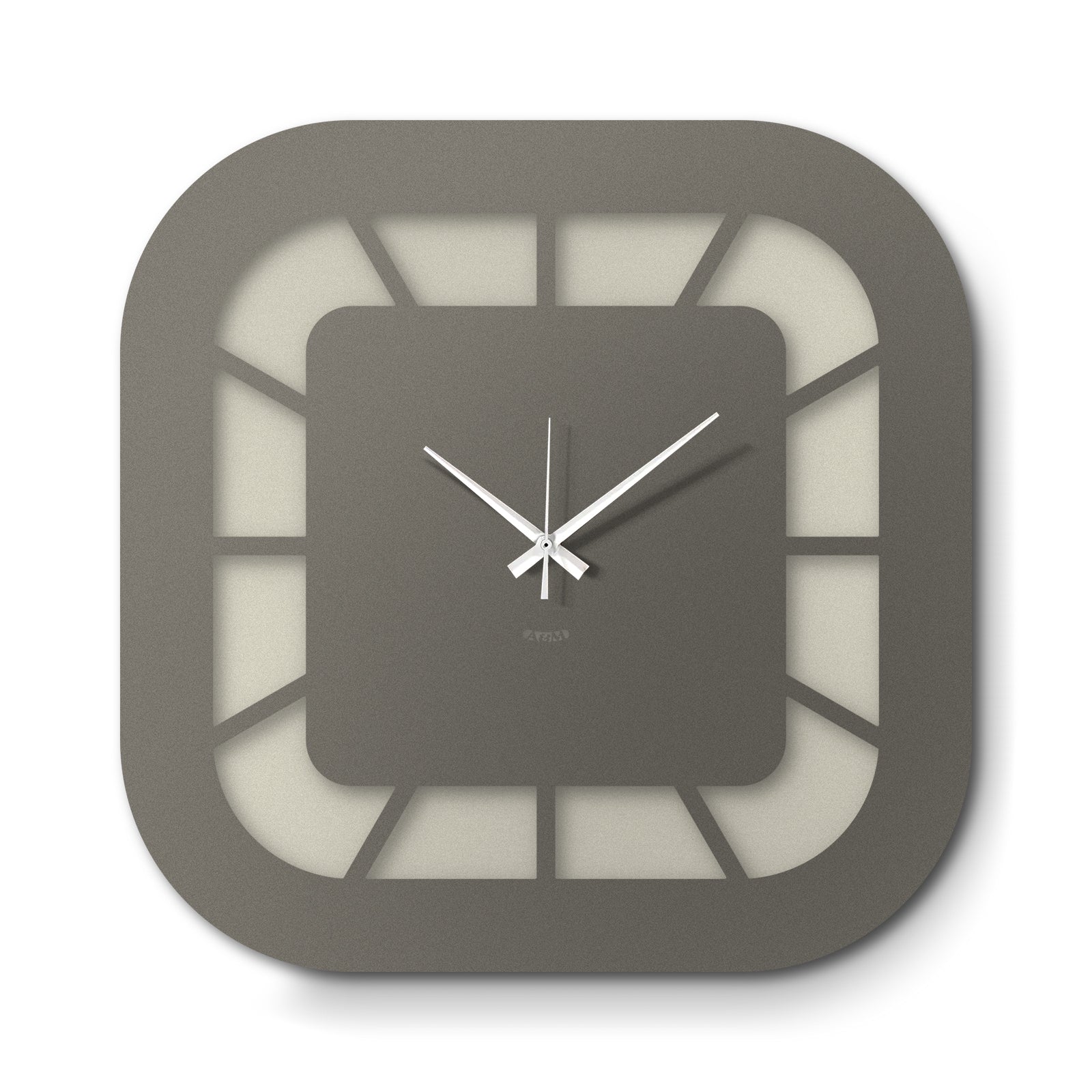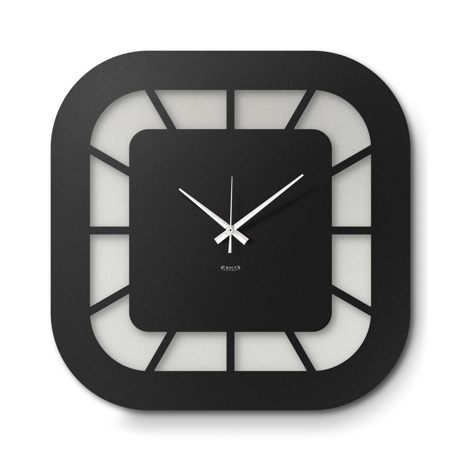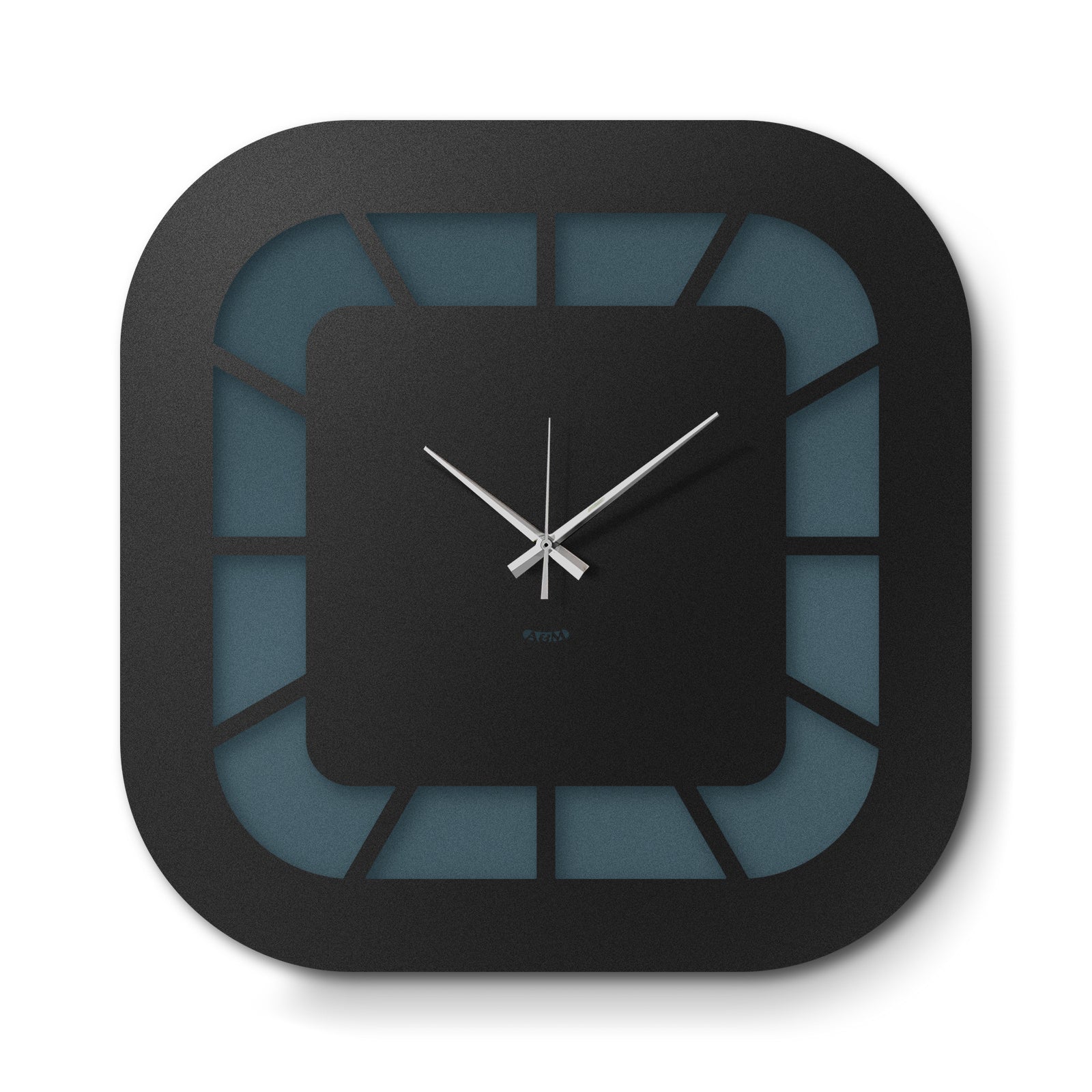 The clock's structure is based on a square with rounded corners, which is repeated in both the central dial and the outer frame. The dial, deliberately smaller than the overall structure, is connected to it by thin lines that radiate outward, creating a clean and light graphic effect. The lower part of the dial is distinguished by a different color than the rest, introducing a visual detail that breaks the symmetry and gives character to the entire piece.