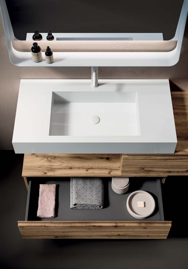 The integrated sink blends harmoniously with the structure of the furniture, while the soft-closing drawers ensure comfort and silence in daily use. The materials used are resistant to humidity, ensuring a long life even in heavily used bathrooms.