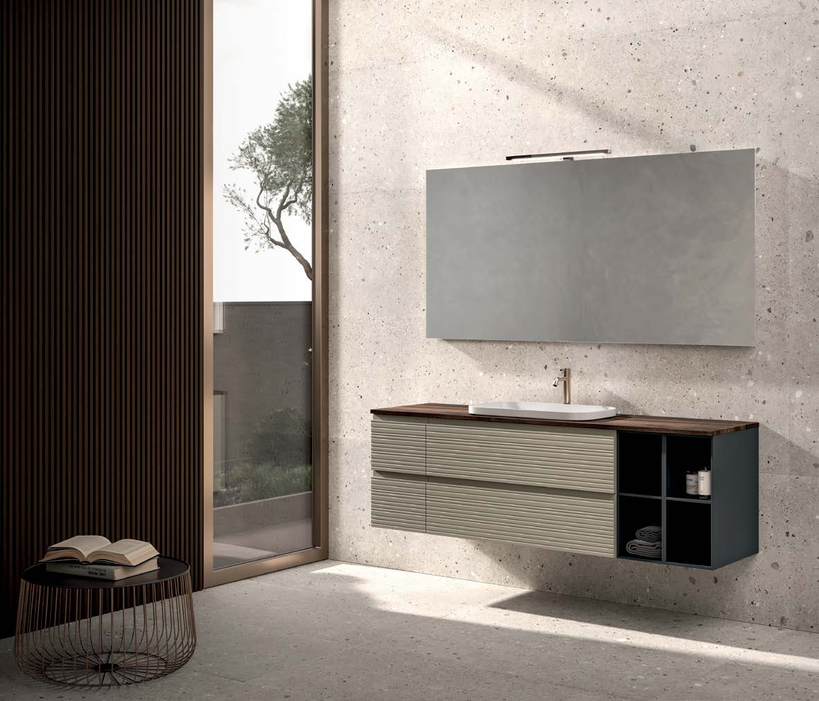 Saturno 114 is available in a variety of finishes and configurations, to best customize the bathroom furniture according to the style and needs of the customer. An elegant and functional choice to enhance the space with the 100% Italian design by Oltrebagno.