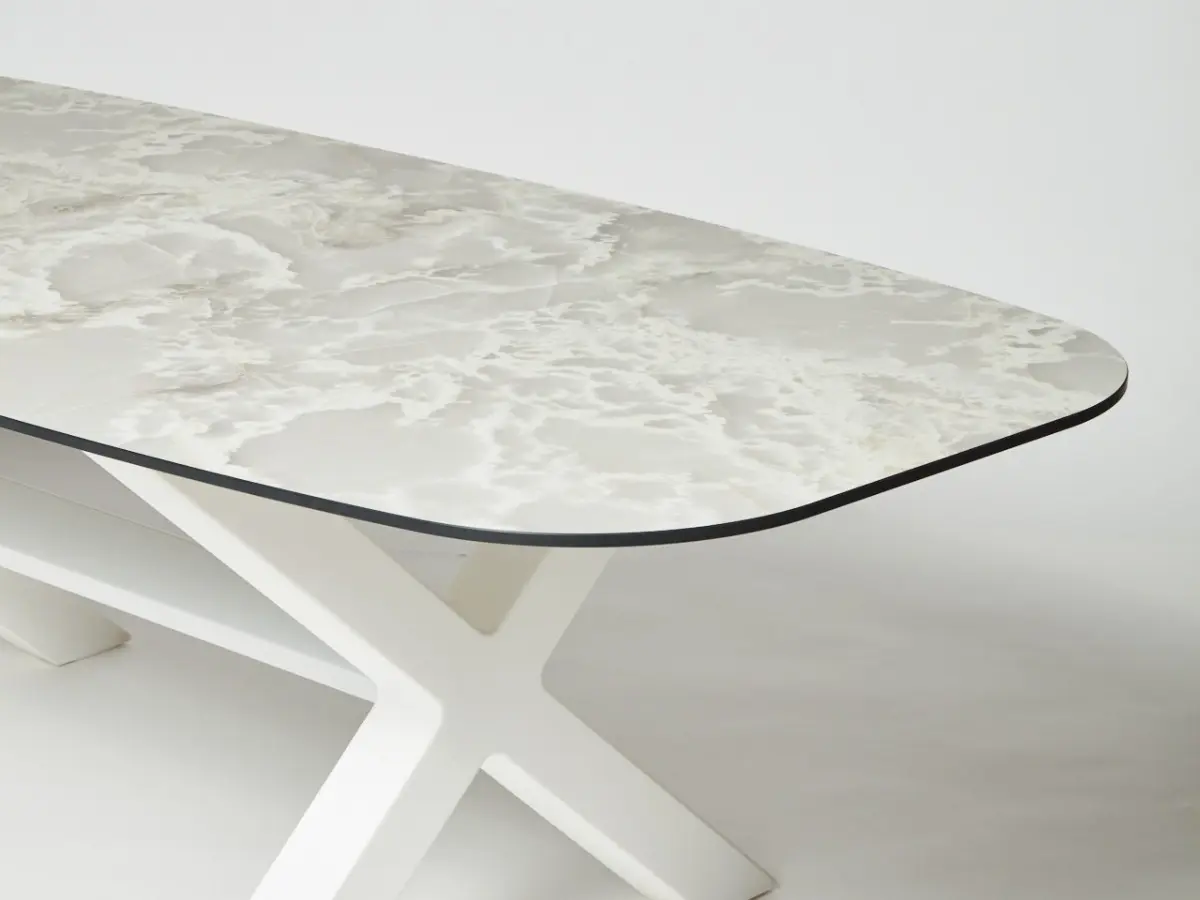 The top of the outdoor tables is made with an innovative material that combines wood and plastic, optimized for outdoor use. This plan is interchangeable, offering several choices. Serralunga offers materials with excellent aesthetic characteristics and notable resistance against abrasion, impacts, scratches, stains and light. Furthermore, a variant with an aluminum surface is available in this varied range of outdoor tables.