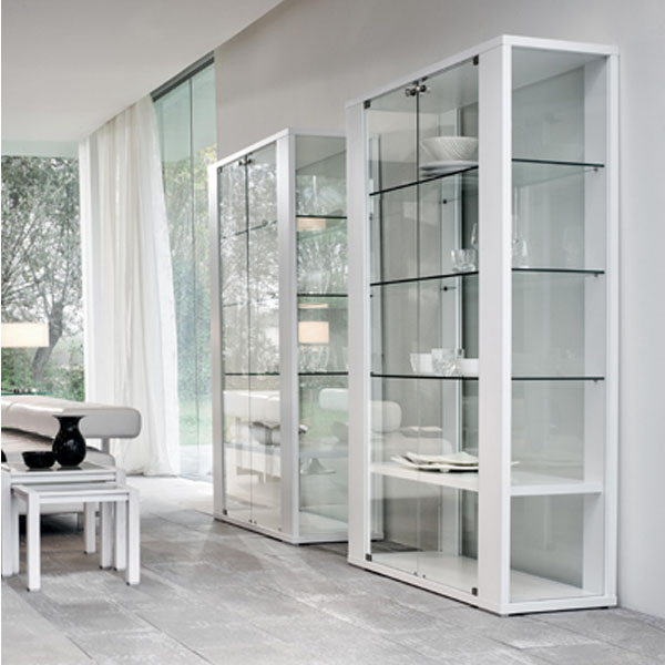 Showcase with wooden sides, back, doors and shelves in transparent tempered glass.