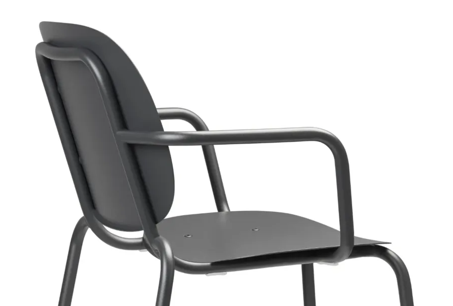 Its name, playful and repetitive, recalls the duality that characterizes it: a single shell, fixed to a simple frame, acts both as a backrest and a seat.