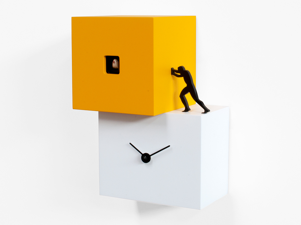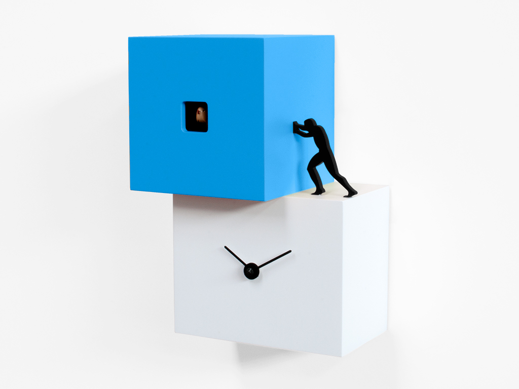 Wall or table cuckoo composed of two or three bodies of different colors moved by man's work, a simple but significant contemporary object, strong and well defined. A cuckoo who wants to spur us on, who reminds us that time passes and it is necessary to move, to find the strength and energy to do what we must. Elements with different sizes and heights, positioned according to a staggered pattern, give life to Strong Cuckoo made of painted wood. Battery quartz movement. A light sensitive sensor automatically stops the ringer in the absence of light.