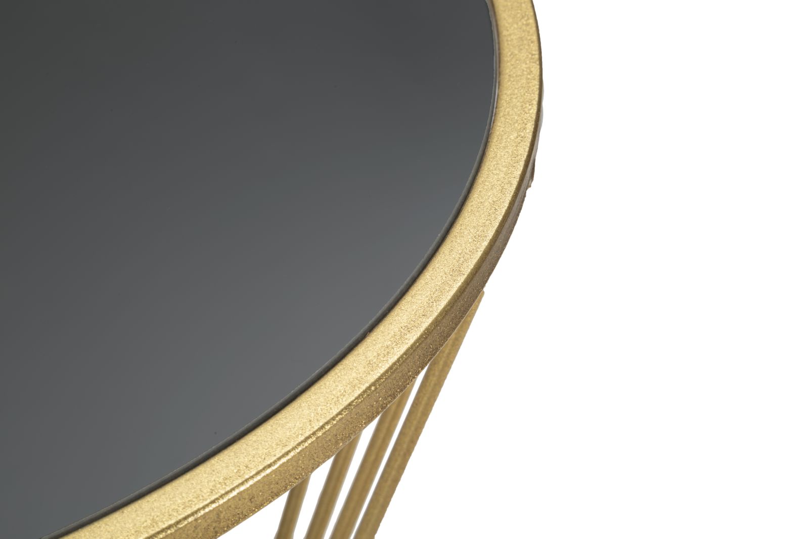 Round coffee table in golden metal with simple and essential lines with mirrored glass top.