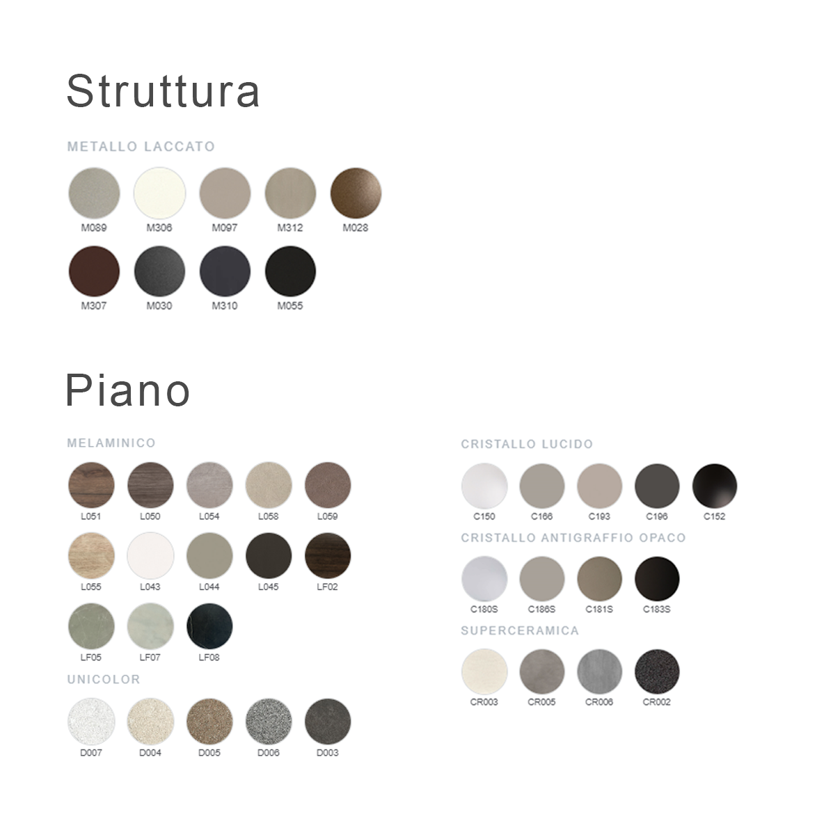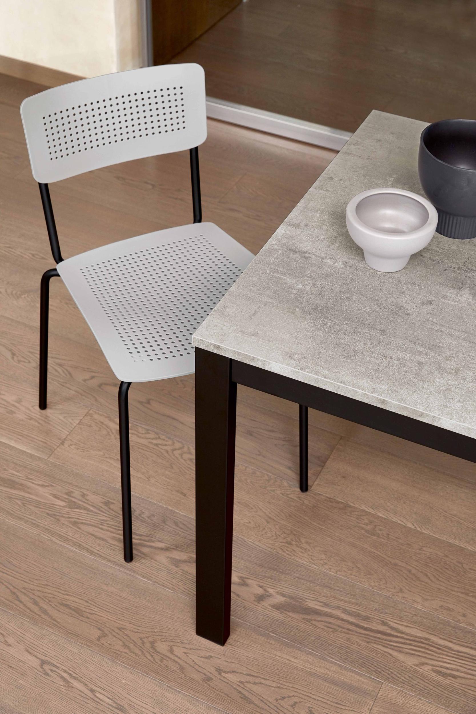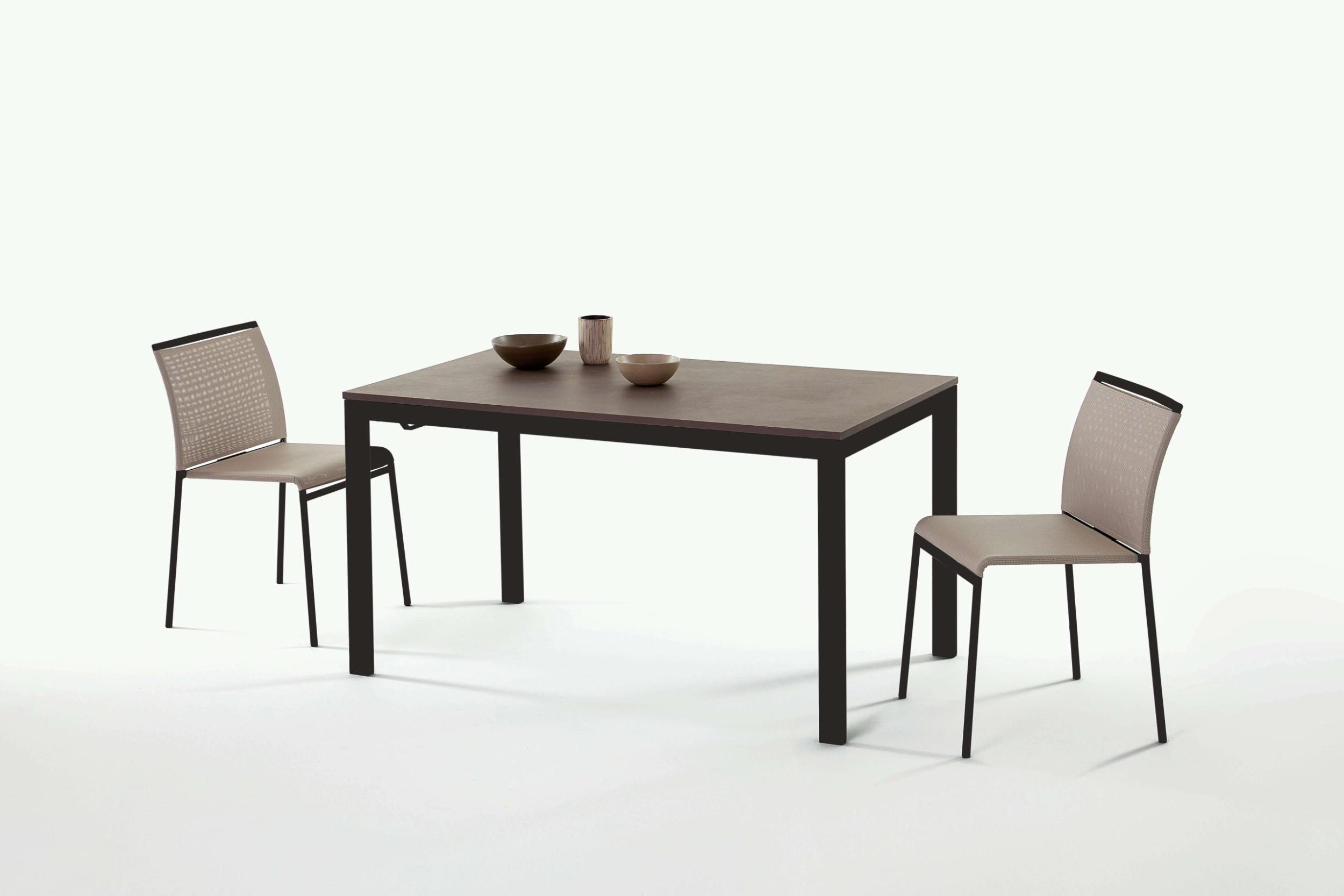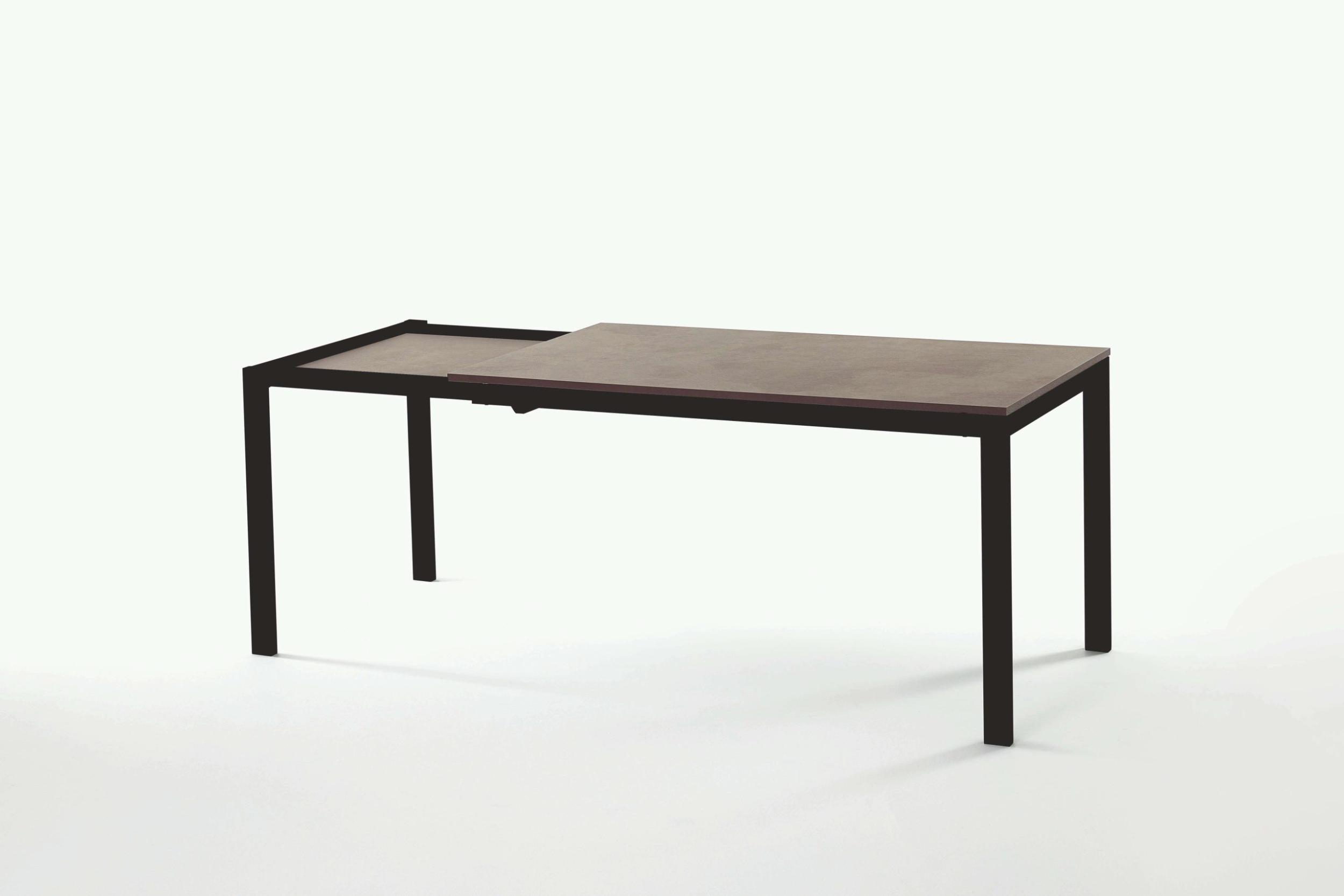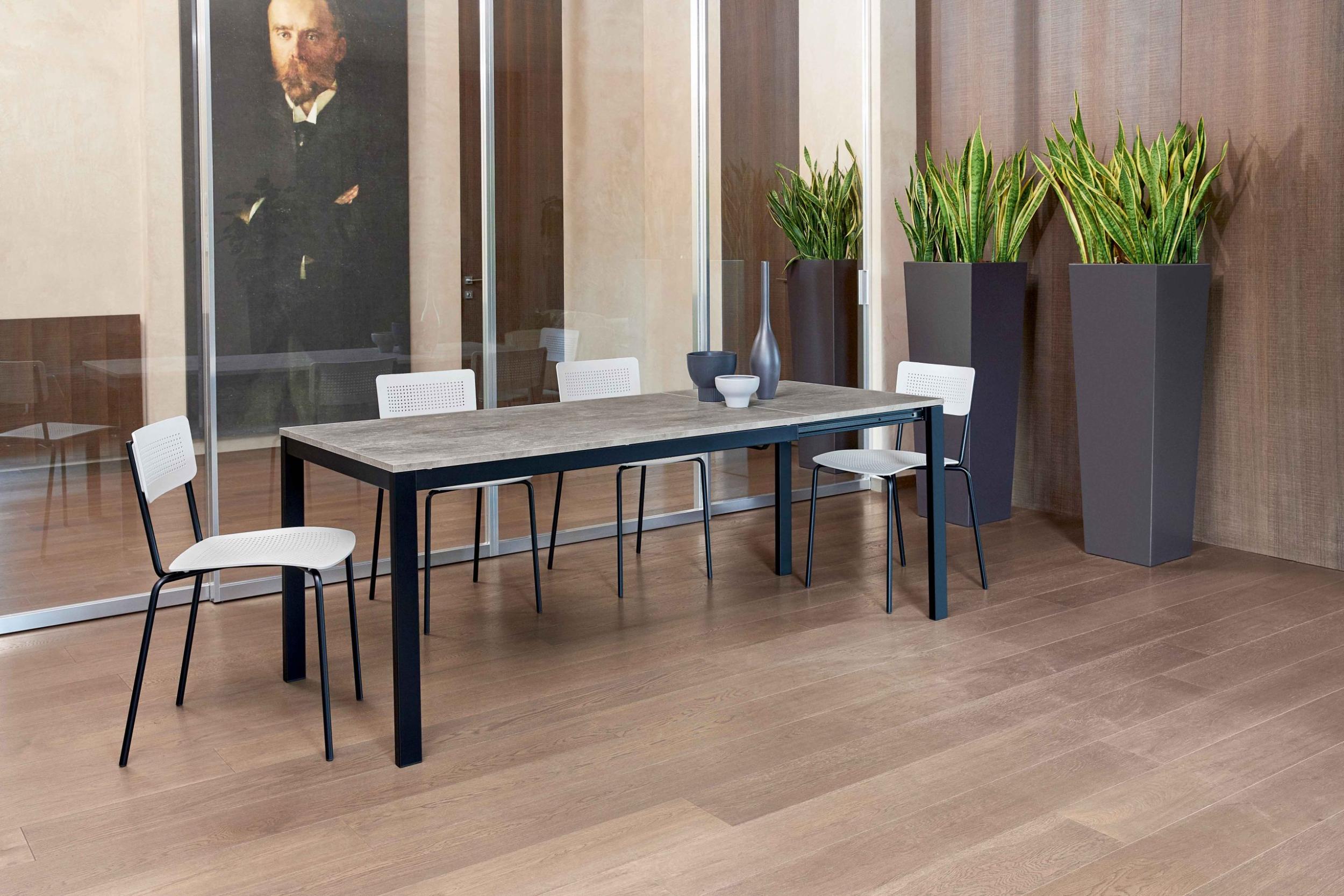 Extendable table with lacquered or chromed steel frame and top in melamine, textured melamine, scratch-resistant Unicolor, crystal, scratch-resistant crystal and SuperCeramic.