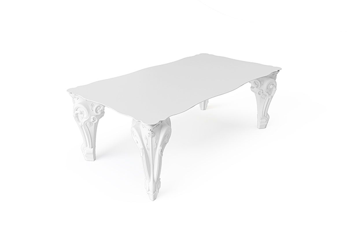 The Sir of Love table is designed by Graziano Moro and Renato Pigatti part of the Design of Love Collection. The majestic corner legs of the table are made of polyethylene, the top in HPL. With its imposing appearance it is ideal for decorating reception rooms, contract, but also domestic spaces, becoming a key element of your interior that with a Rococo touch will transform any occasion into a gala event. The choice of color refers to the table legs.