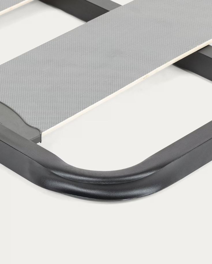 Bed base with graphite-colored metal frame and carbon-fiber-effect wood slats. Sound-absorbing polyethylene gaskets. Includes plates compatible with X or S legs (not included). Use four legs.