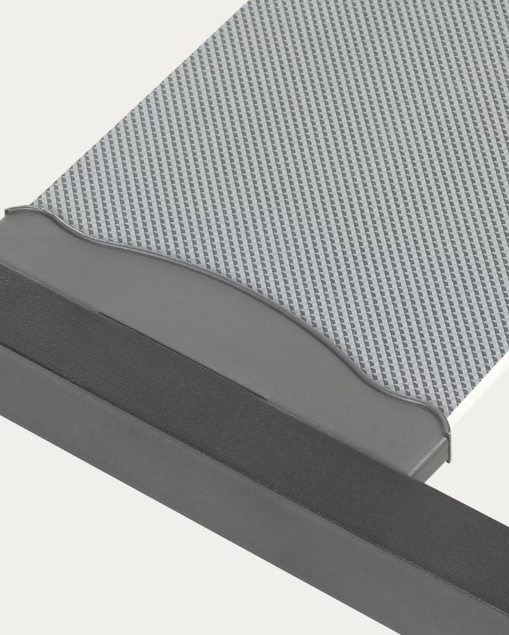 Bed base with graphite-colored metal frame and wooden slats finished with a carbon fiber effect.