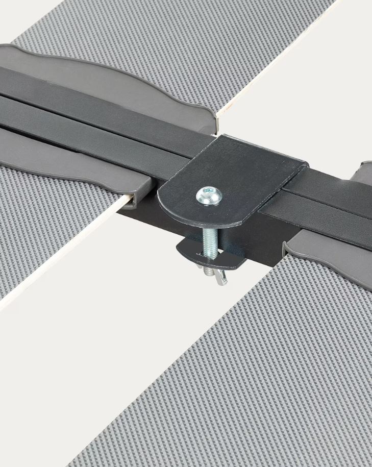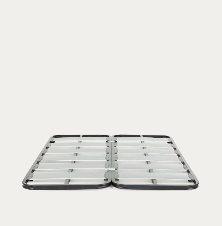 Bed base with graphite-colored metal frame and carbon-fiber-effect wood slats. Sound-absorbing polyethylene gaskets. Includes plates compatible with X or S legs (not included). Use four legs.
