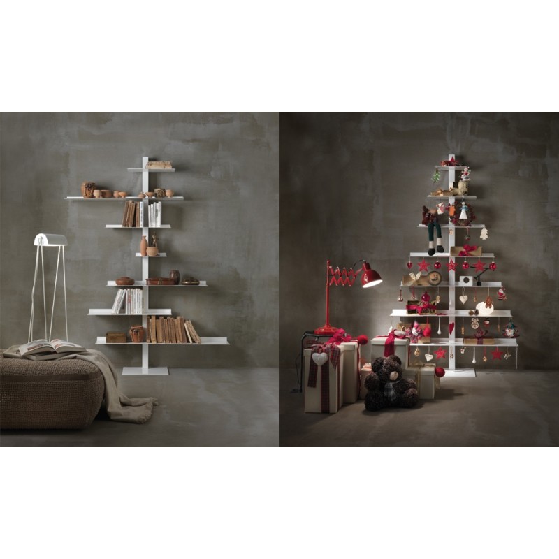 A distinctive aspect of the Tiche bookcase is the possibility of customizing it for different occasions. During the holidays, it can be transformed into an original Christmas tree, thanks to the shelves equipped with holes for hanging decorations. This feature makes it not only functional, but also a decorative piece of furniture that evolves with the seasons.