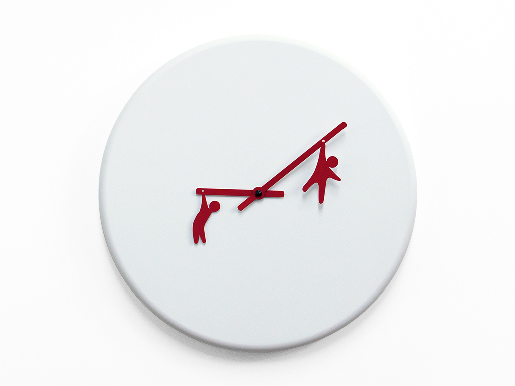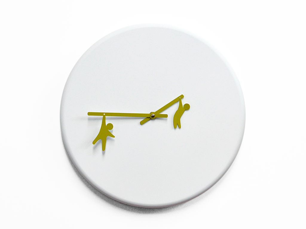 The watch demonstrates the desire to interpret the passage of time in an ironic and playful way, bringing a little happiness at any time of the day. The little men clinging to the hands show their show as circus trapeze artists. Made of wood. Battery quartz movement.