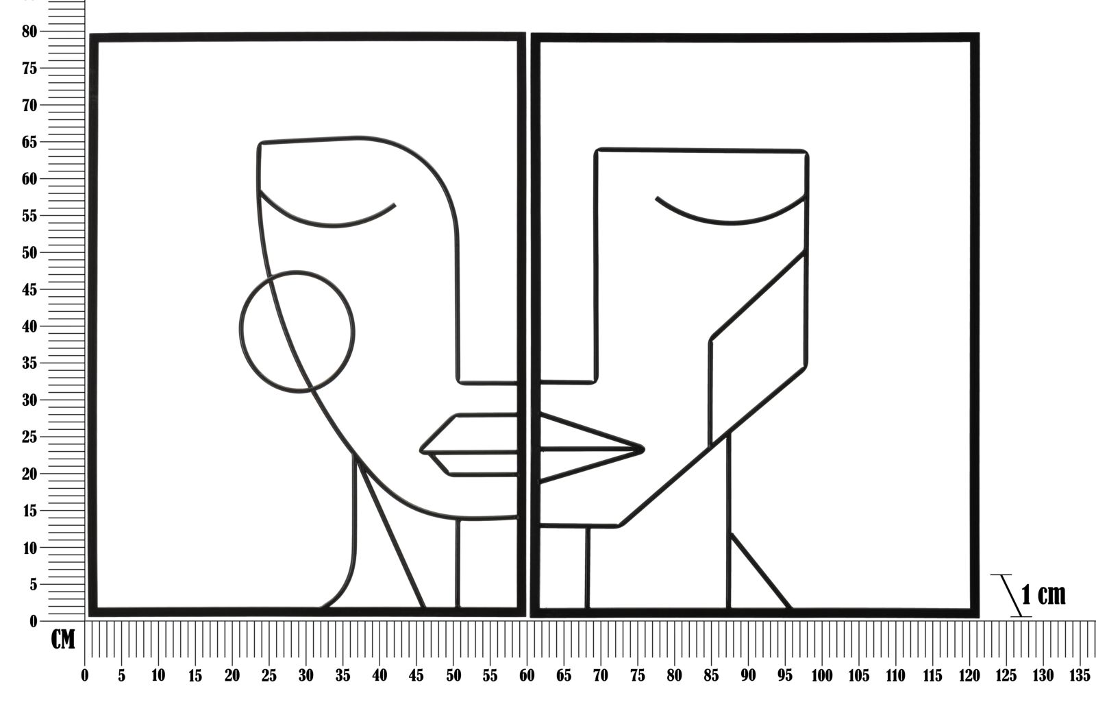 Pair of decorative 3D metal panels depicting faces with stylized lines that recall cubism. A touch of class and sophistication for any environment.
