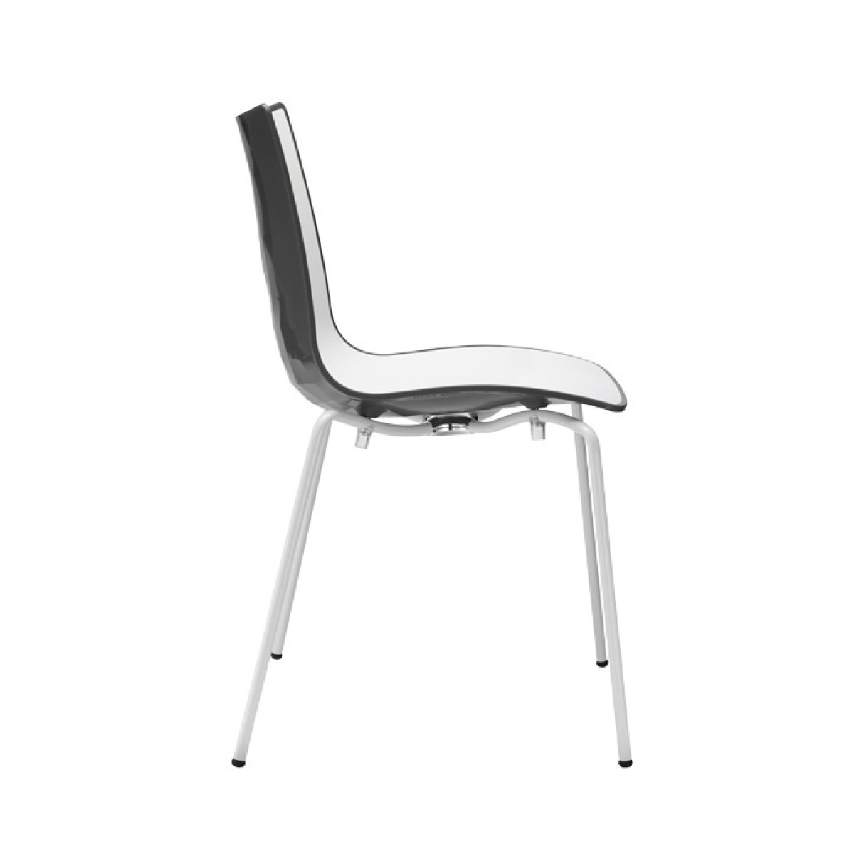 The chair features a two-tone polymer shell, which combines a smooth, glossy interior with an exterior featuring a shiny, faceted surface, creating a captivating and modern visual effect.