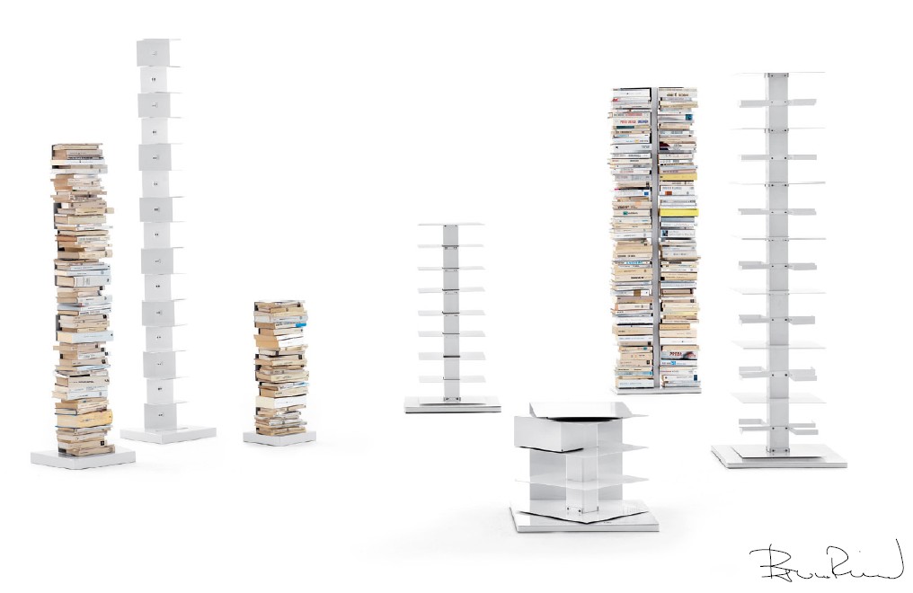 Vertical self-standing and 360 ° rotating bookcase. Base engraved with the designer's signature. Available in three different versions: Kit A, Kit B, Kit C. Finish: Structure and shelves in white or black lacquered metal. Polished stainless steel base for the black version and white lacquered for the white version. Accessories: Extension in white or black lacquered metal. Magnet stops cd. Dimensions: 52x52xh110 cm The price refers to the setting B 110 cm high, consisting of 4 shelves spaced 26 cm apart, vertical positioning of the books. 140 total volumes. Specify by email at info@tecnoarredo3.com if you want the WHITE BASE WHITE or BLACK BASE STAINLESS variant