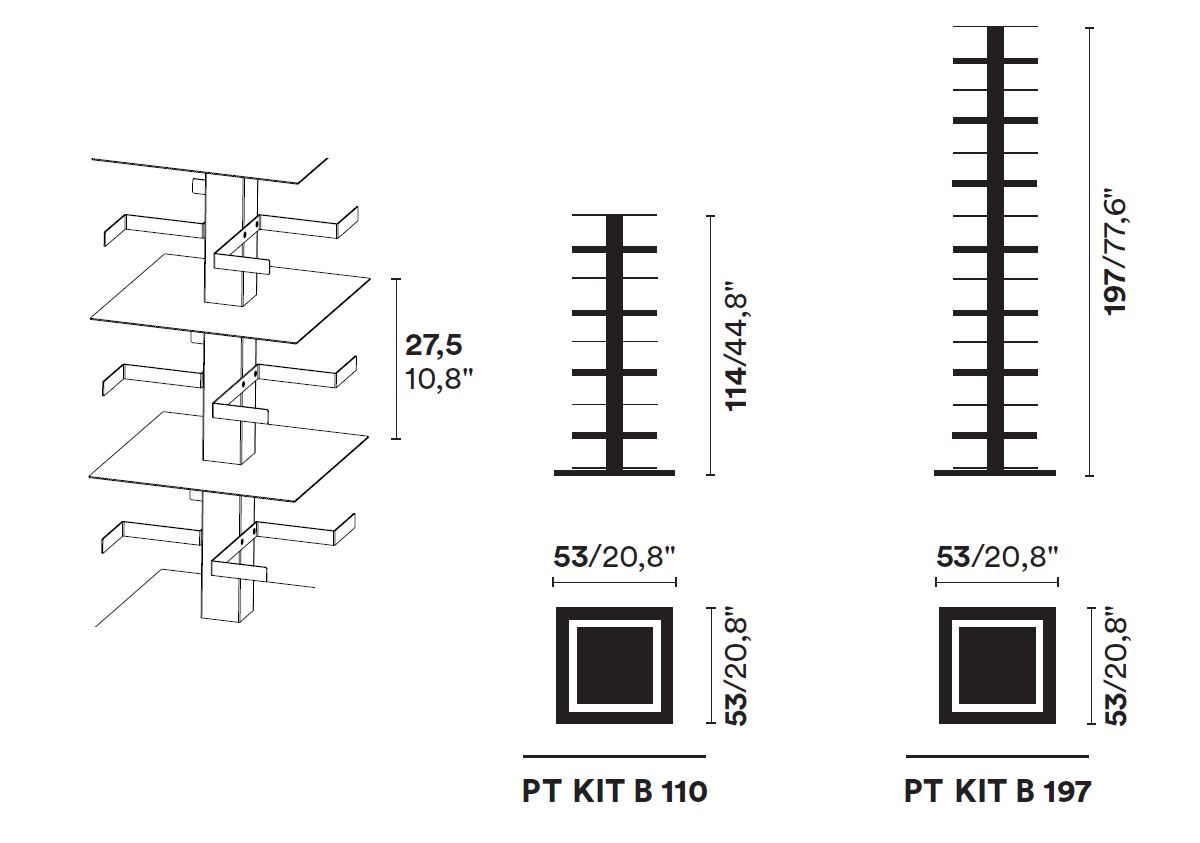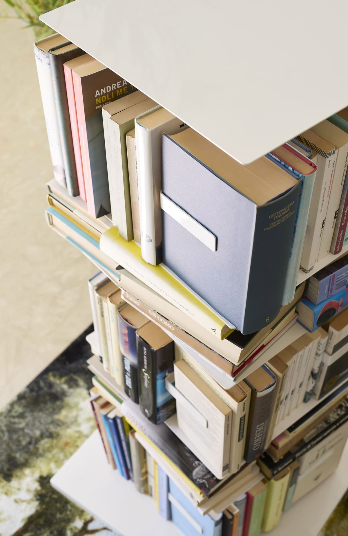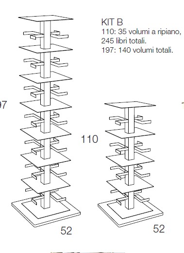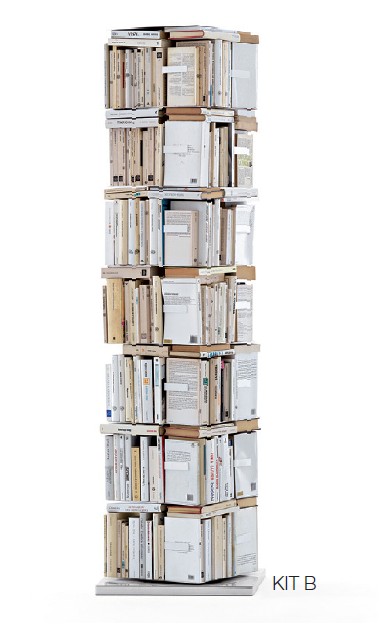 Vertical self-standing and 360 ° rotating bookcase. Base engraved with the designer's signature. Available in three different versions: Kit A, Kit B, Kit C. Finish: Structure and shelves in white or black lacquered metal. Polished stainless steel base for the black version and white lacquered for the white version. Accessories: Extension in white or black lacquered metal. Magnet stops cd. Dimensions: 52x52xh197 cm The price refers to setting B consisting of 7 shelves spaced 26 cm apart, positioning the books vertically. About 35 shelf volumes, 245 total books. Specify by email at info@tecnoarredo3.com if you want the WHITE BASE WHITE or BLACK BASE STAINLESS variant