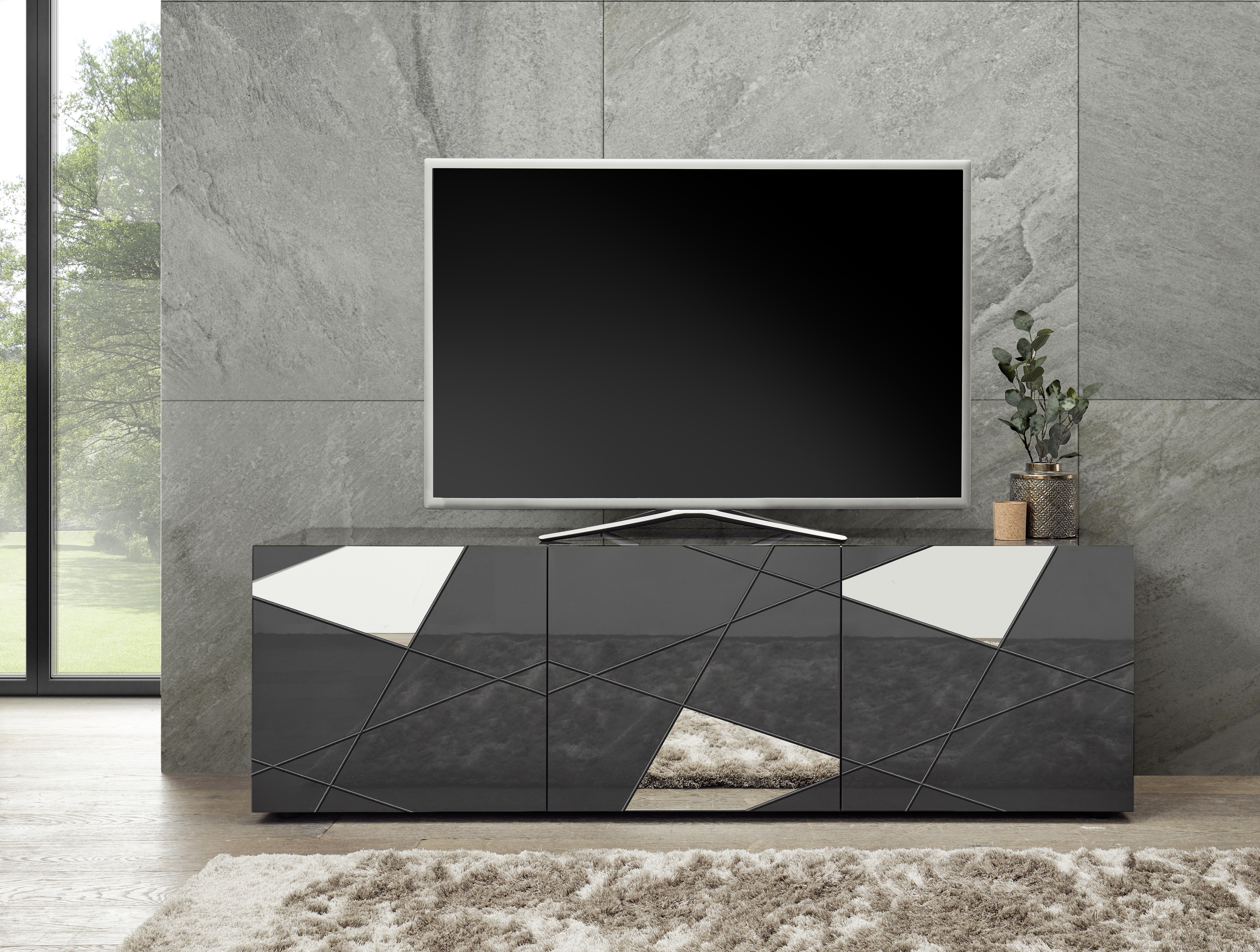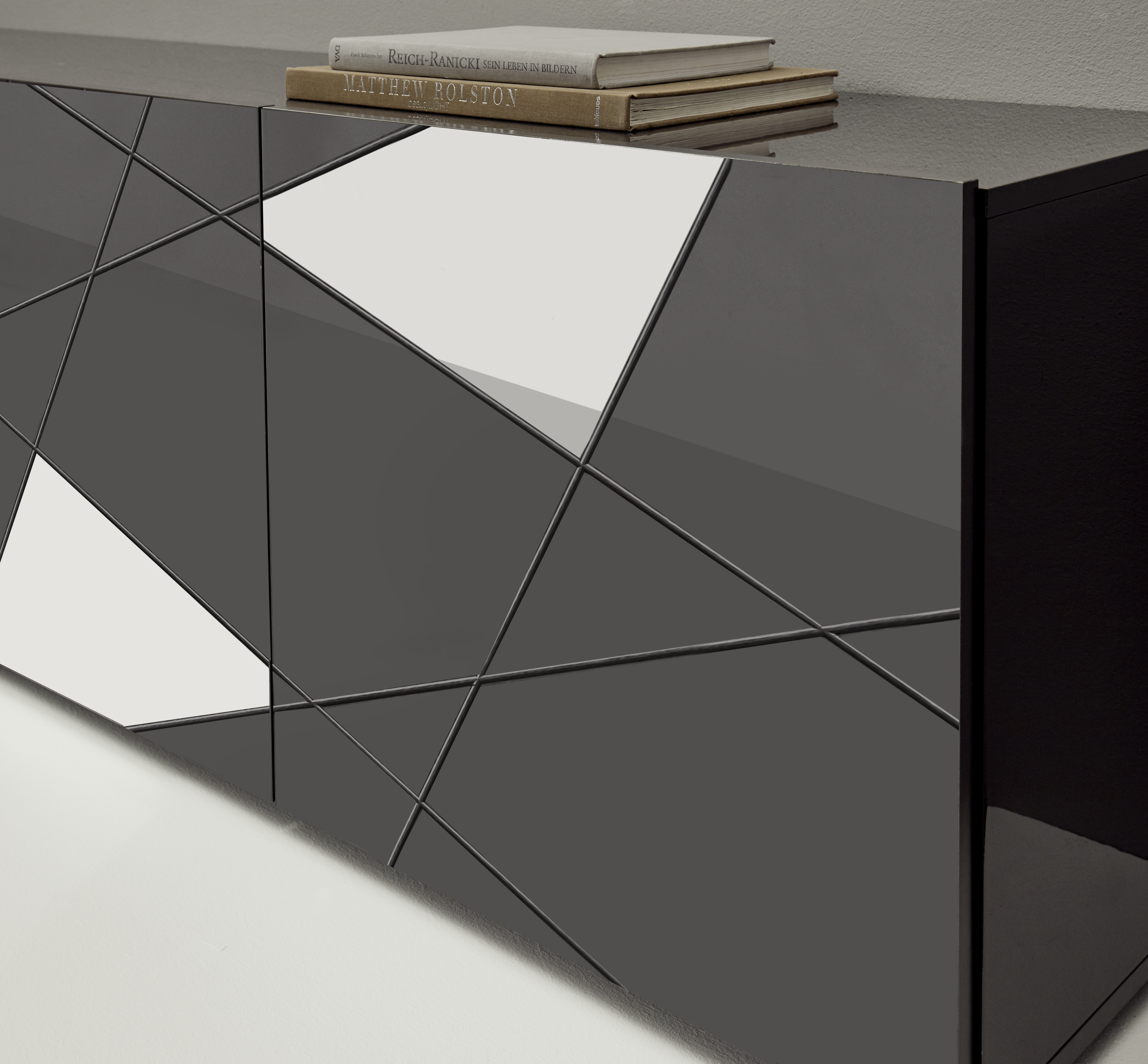 | Finish | Glossy lacquered grey with silkscreen prints and mirrors |