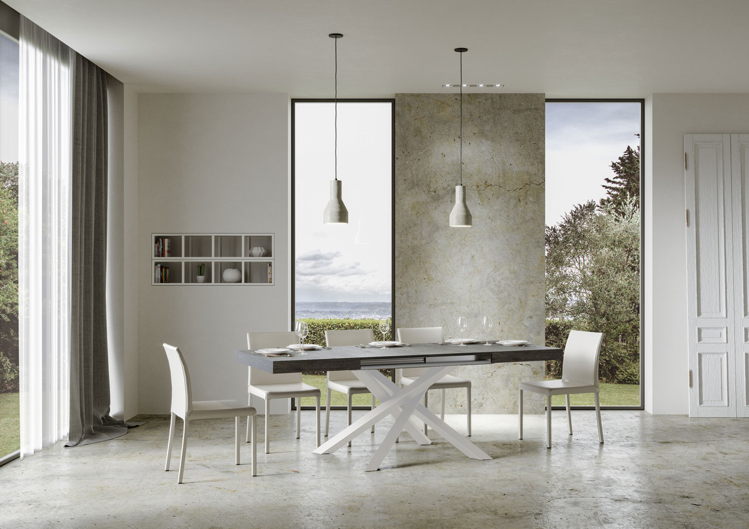 Extendable table Volantis 130 modern and sophisticated in design, fits perfectly in any furnishing style and it proves to be the perfect choice both as a dining table and as a design furnishing piece for the living room, where you can welcome your guests in style. The extendable table Volantis can extend progressively up to 390 cm, and is able to accommodate up to 16 people. Made of melamine boards, iron legs, tabletop worked in miter folding technique. The extending mechanism with aluminium telescopic rails and the provided lateral supports make the table steady and sturdy even when fully extended. When not used, two extension leaves can be stored beneath the tabletop, ready to use. The other three leaves have to be stored elsewhere. Itamoby product Made in Italy Sizes: Closed table: L.130 D.90 H.77 cm Length with 1 extension leaf: 182 cm Length with 2 extension leaves: 234 cm Length with 3 extension leaves: 286 cm Length with 4 extension leaves: 338 cm Length with 3 extension leaves: 390 cm