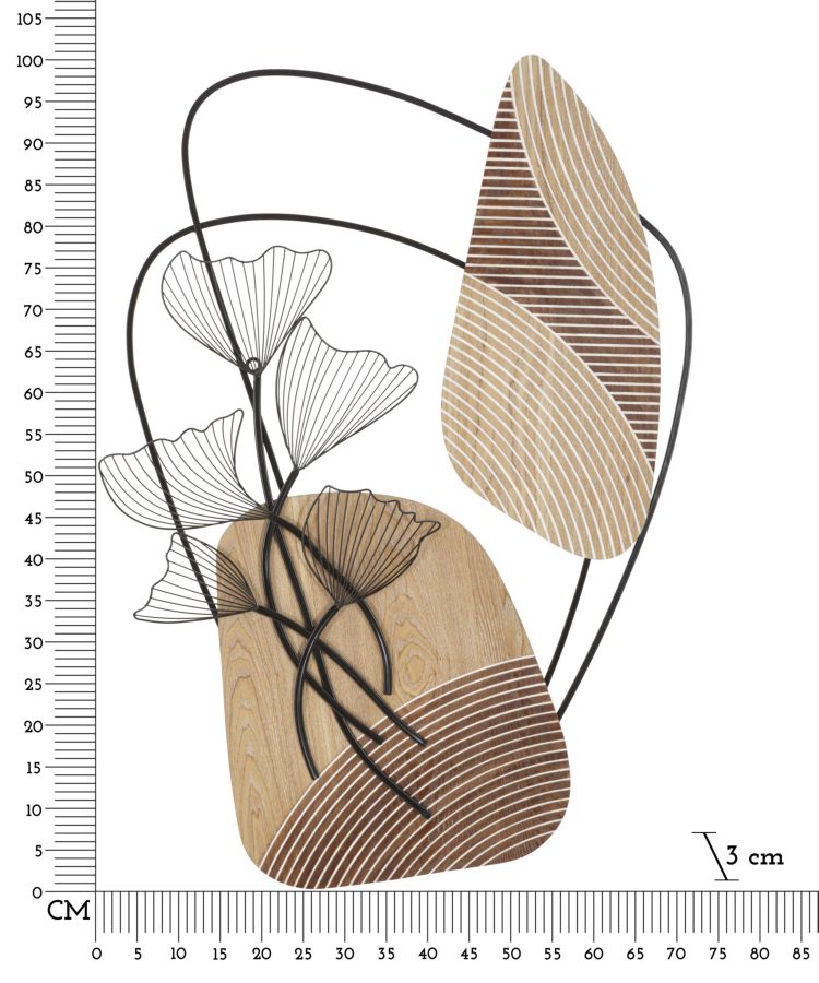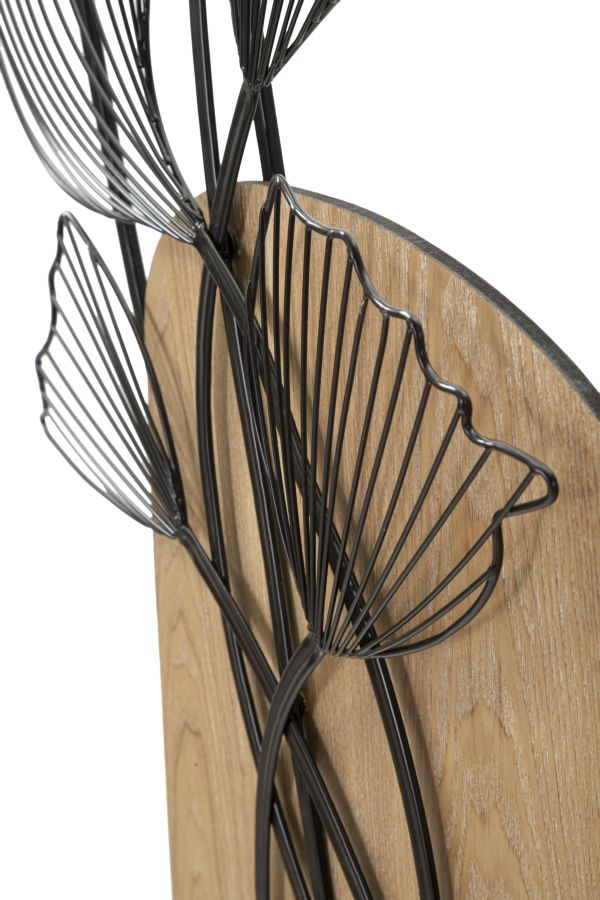 3D decorative wall panel in metal and wood with abstract shapes and embellished with elegant leaves.