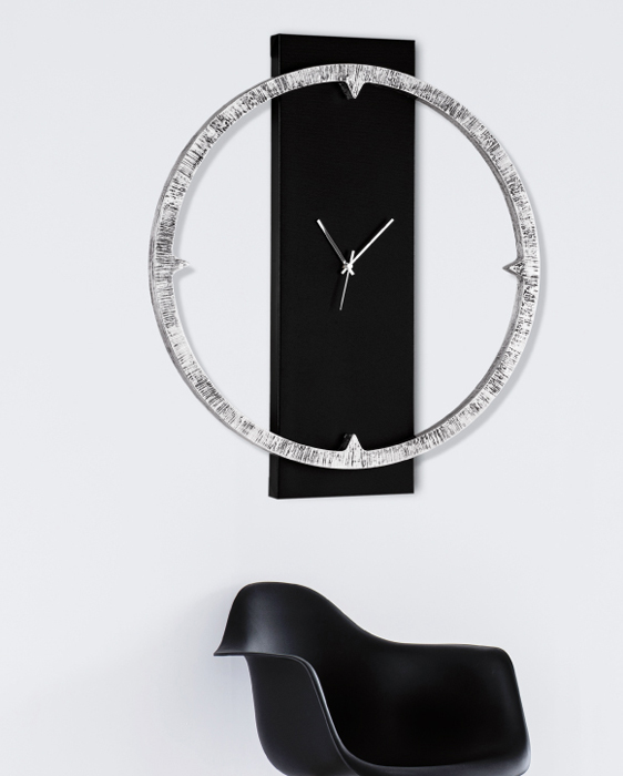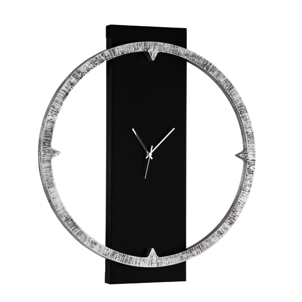 Shaped clock, black lacquered, hand-decorated with silver leaf on textured.