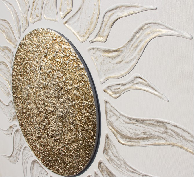 Ivory lacquered and hand-decorated canvas structure with embossed textured finish and central element in silver leaf.