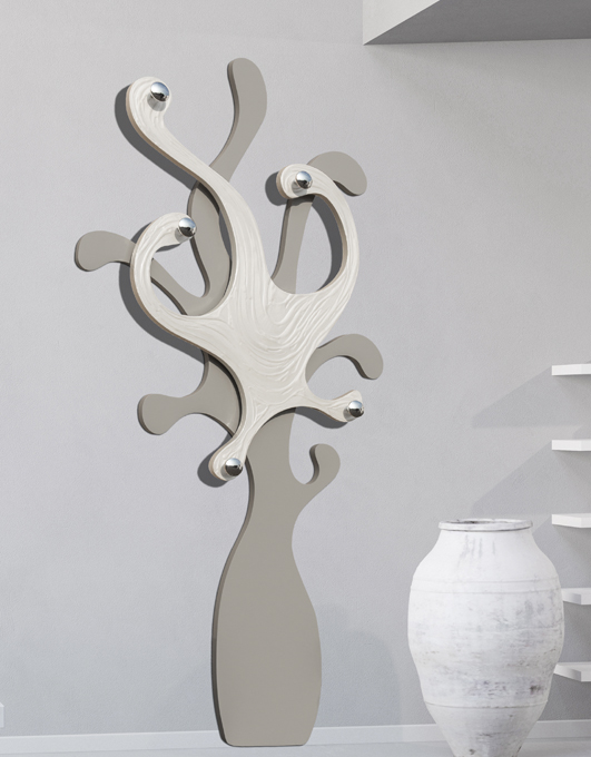 The White Octopus Coat Stand P2479 by Pintdecor is a uniquely designed piece of furniture, ideal for those seeking elegance and functionality. With a dove-grey lacquered shaped structure and five chrome-plated knobs, this coat stand stands out for its textured workmanship in relief, hand-decorated with a mother-of-pearl effect.